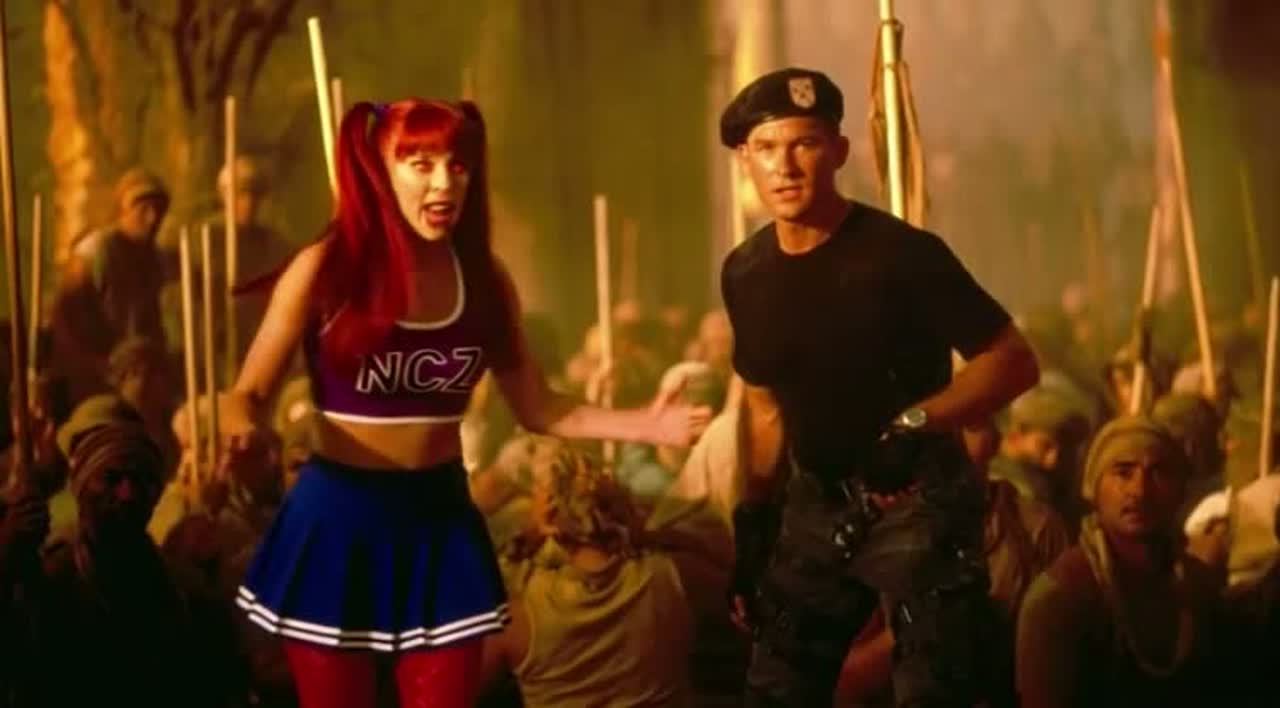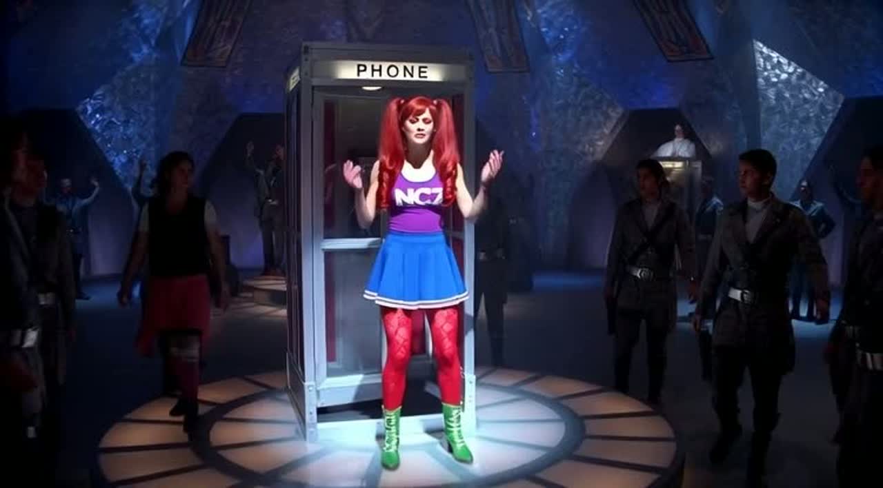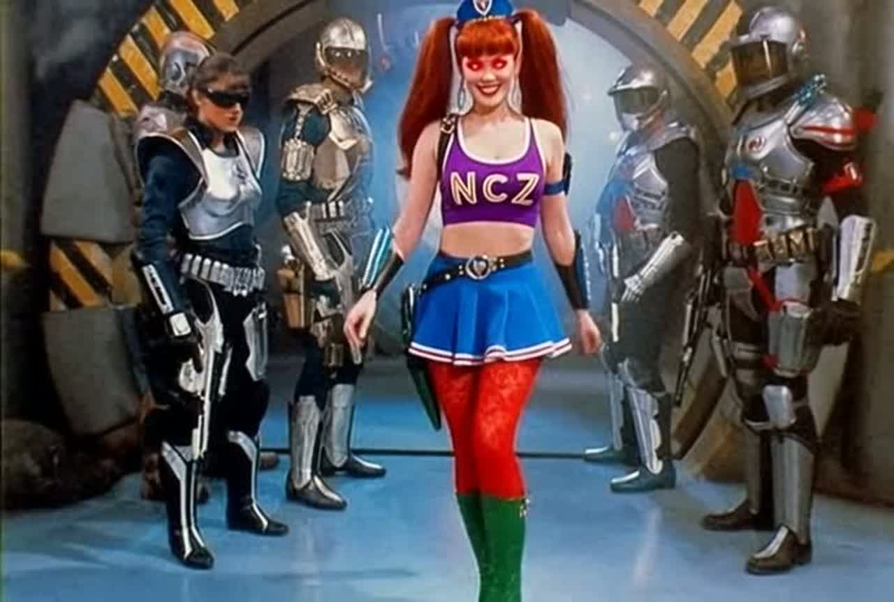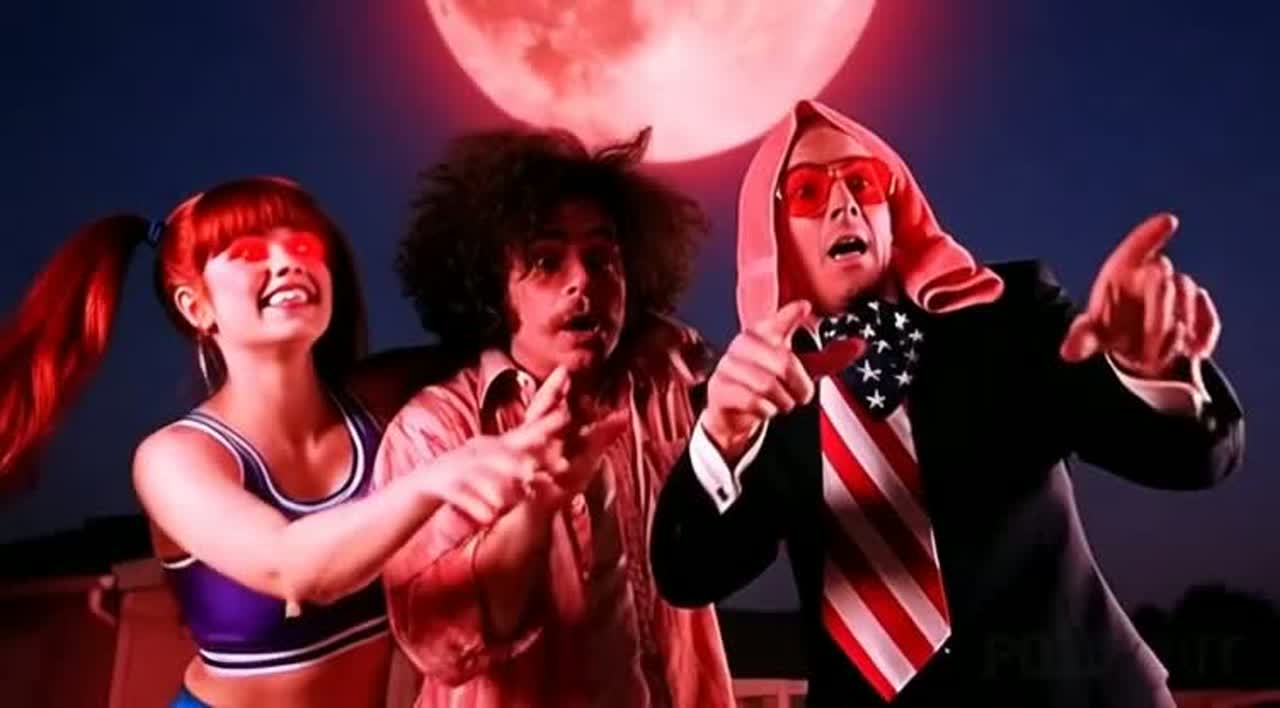 satirical darksynth + glitch-hop + retro TV jingle / infomercial energy, punchy drums, buzzy bass, VHS hiss, cheesy “corporate” synth stabs, crowd-chant hook, quick comedic spoken cut-ins, alien radio-filter ad-libs, big stadium build on the chorus, cinematic end, female with male backups (use the input audio for voices)