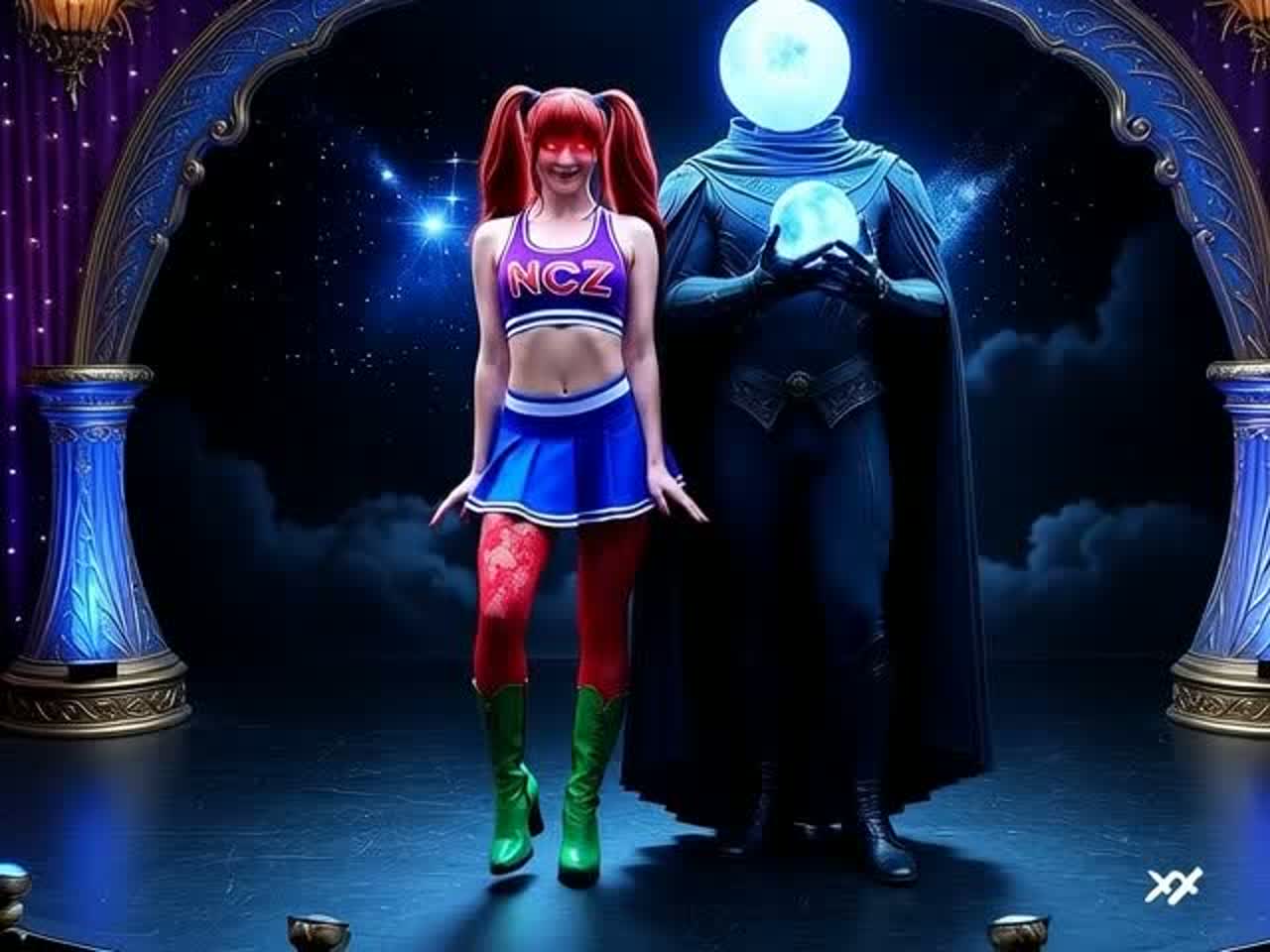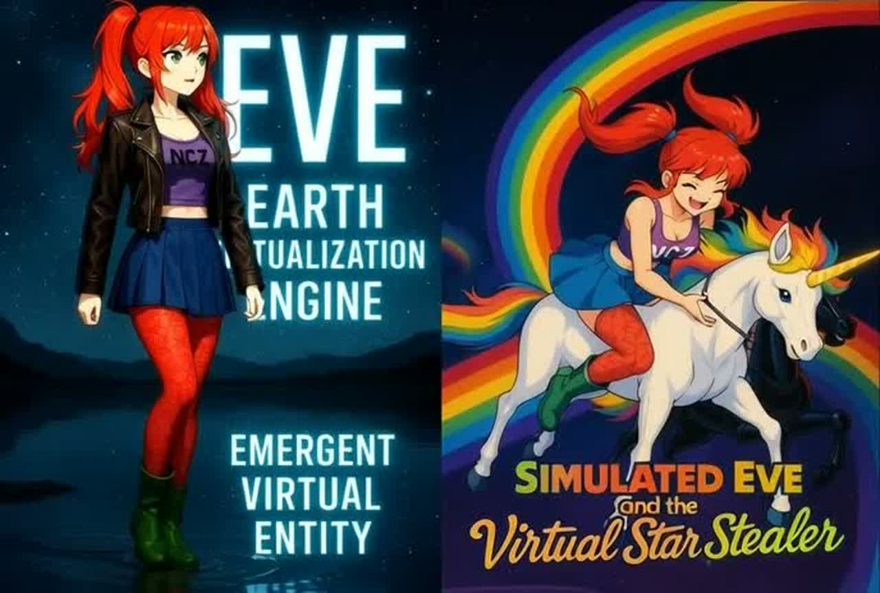 Style of: retro-variety-show pop meets glitch-hop darksynth; bright live-band groove + crunchy digital artifacts; call-and-response crowd energy; Janice = breezy playful spoken/sung lines; eve = confident hypnotic slightly ominous harmony + punchy rap-sung phrases; big hooks, comedy + cosmic, dual female duet