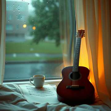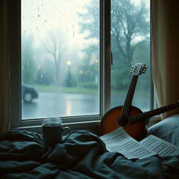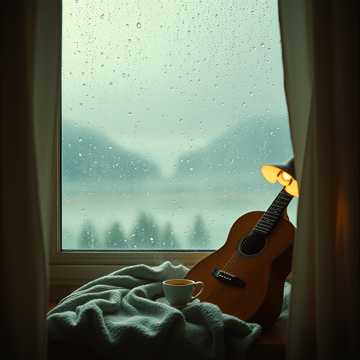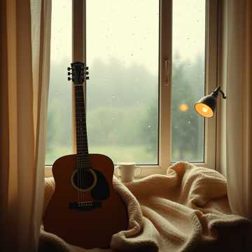 Mid-tempo jazz-inspired track with soft guitar and piano, subtle brushed drums, ambient rain and nature sounds, gentle swing rhythm, emotive vocals reflecting nostalgia, rich choir harmonies in the chorus, expressive violin and cello, soulful harmonica, smooth jazz chords and light improvisation, warm atmospheric production, evoking cozy indoor moments, introspection, and creative inspiration