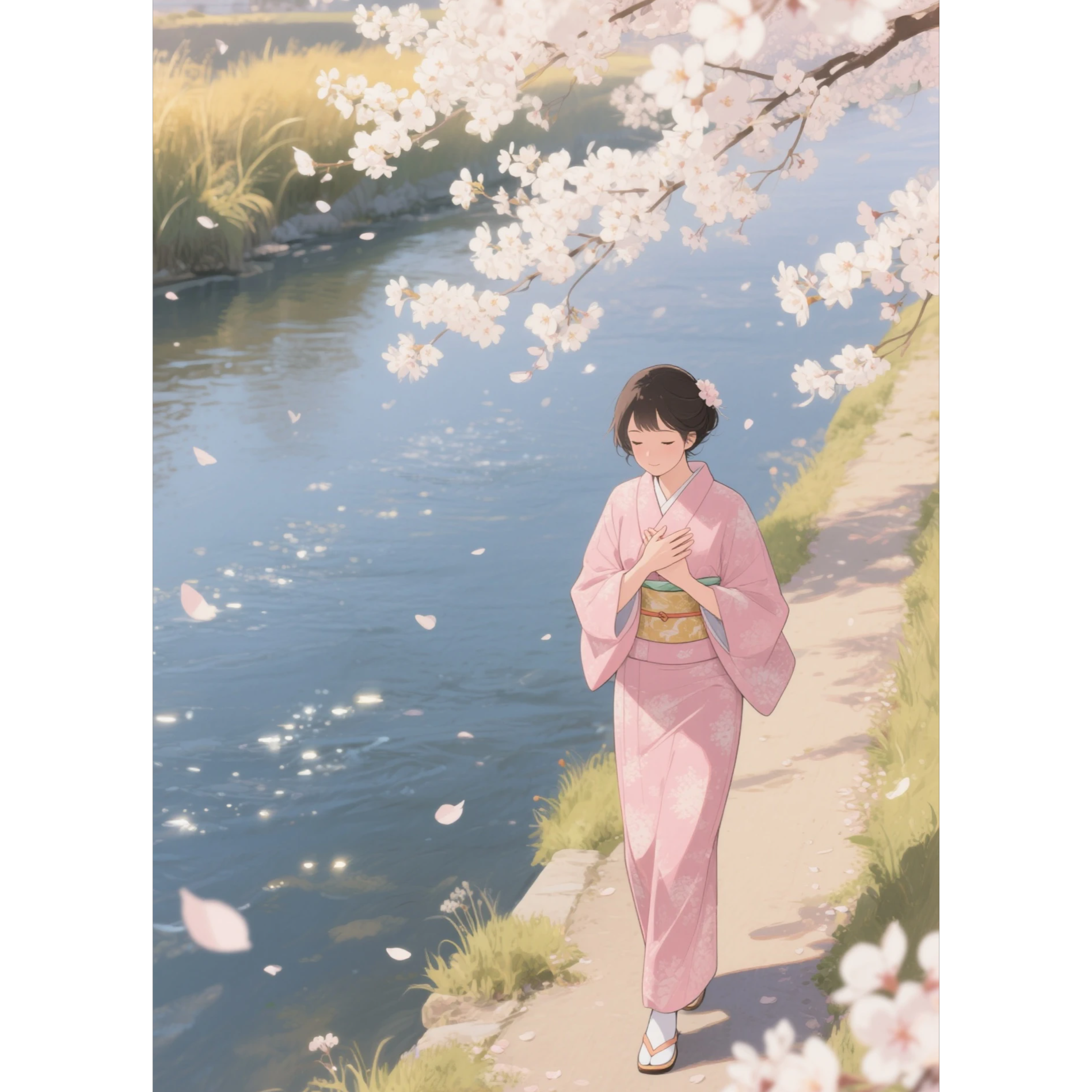 A moderately upbeat enka song with traditional Japanese instruments (shamisen, shakuhachi, taiko) and a gentle yet steady rhythm, female vocal with expressive vibrato and emotional delivery, The tempo is slightly faster than classic enka, creating a sense of forward movement without losing its nostalgic and sentimental tone, Instrumentation includes soft strings and subtle festival percussion, evoking the feeling of a journey through bittersweet memories, Suitable for themes of love, longing, and quiet determination