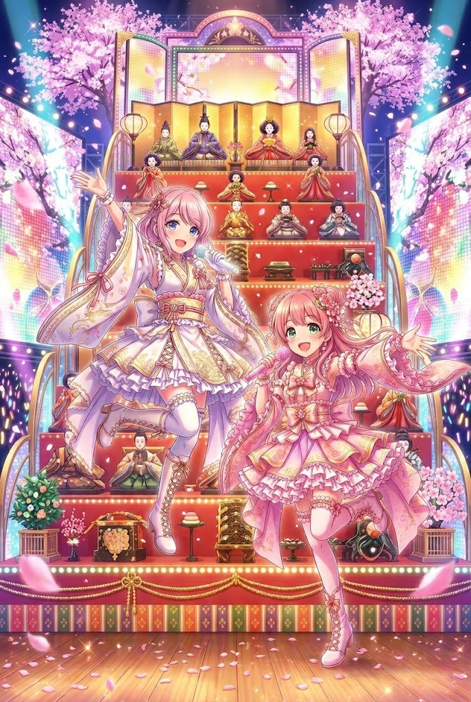 A Japanese-style idol pop song centered around traditional instruments, Shamisen-driven intro riff, koto arpeggios, light and rhythmic taiko drums, and melodic shinobue flute, Solo female idol vocal with a cute, youthful, slightly anime-like tone, Theme inspired by spring, cherry blossoms, peach blossoms, and Hinamatsuri festival, Emotional and elegant pre-chorus, followed by a bright and catchy sing-along chorus with claps, A fusion of traditional Japanese sound and modern idol pop energy
