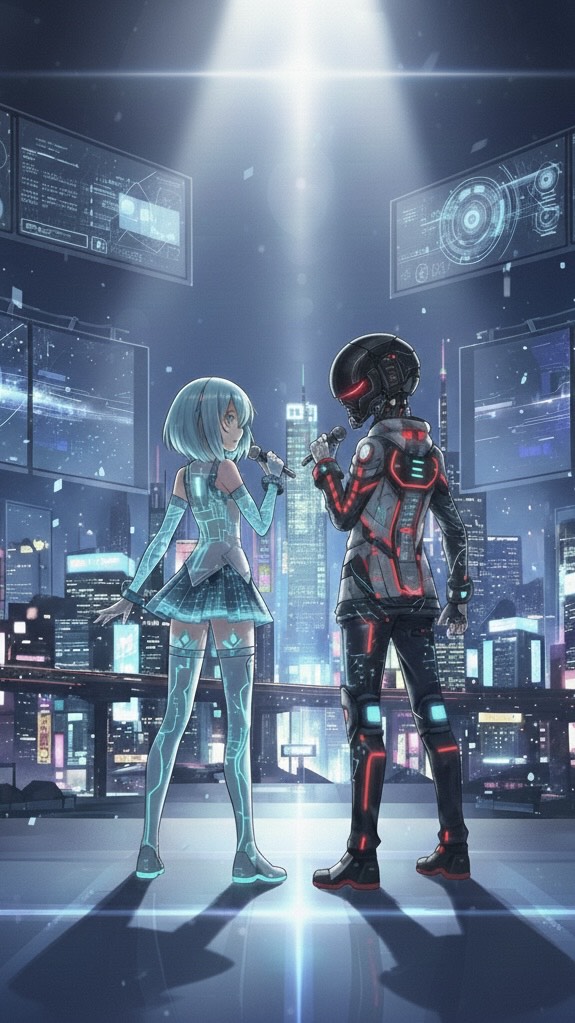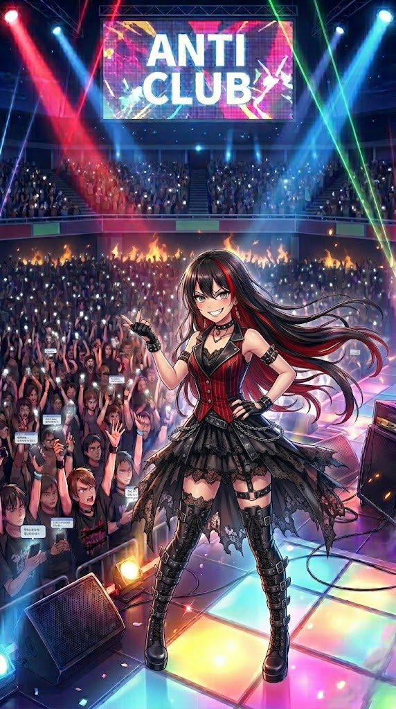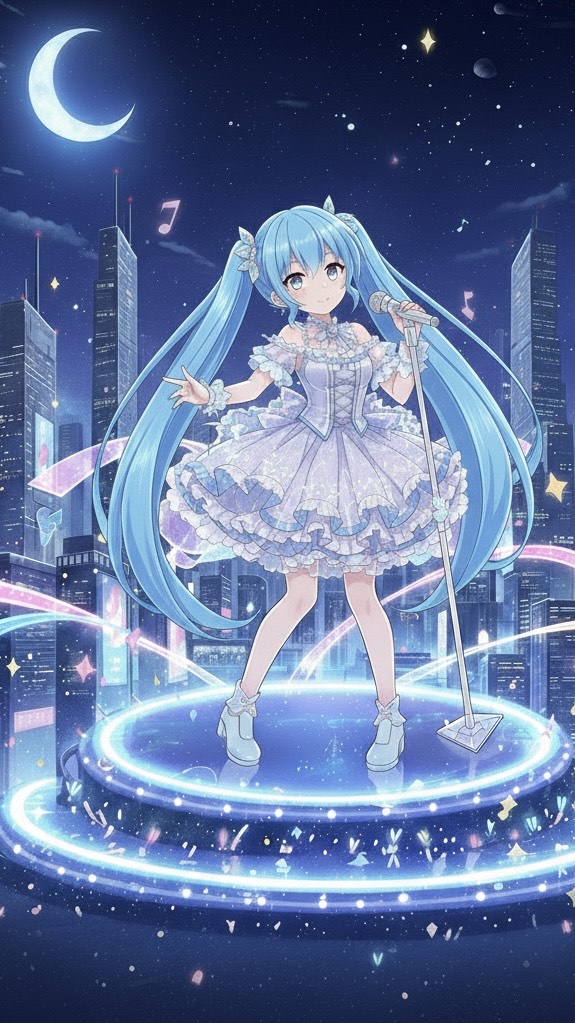 Create a high-energy anime insert song with a stage performance vibe, where the characters sing and dance in a neon-lit city, The tempo should be around 140 BPM, with a strong, intense but cute feel, Use a vocaloid-style electro-pop sound with bright synth leads, fast arpeggios, punchy bass, and energetic drum patterns, Add modern electronic elements like side-chained pads, glitch effects, and sparkling chiptune textures, The arrangement should feel like a live stage performance with crowd energy and a big chorus impact, Include sections where humming appears, but convert those humming parts into synth melodies (synth hums) that blend with the vocal, The vocal should be a cute anime-style female voice with clear articulation, energetic delivery, and occasional harmonies, Lyrics should be in Japanese, upbeat and confident, about performing on stage at night, chasing dreams under neon lights, and feeling unstoppable, Provide a full song structure (intro, verse, pre-chorus, chorus, bridge