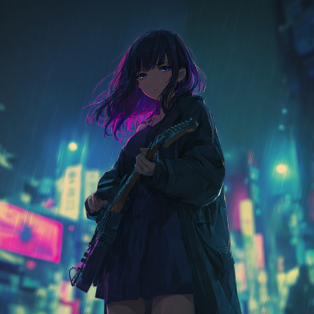 Live concert, City Pop Synthwave Rock, 124BPM, female alto vocal group (3–4 voices) with layered harmonies, twin electric guitars (×2) — one lead with shimmering clean tone and reverb, one rhythm with warm chorus texture, electric bass with smooth groove, drum set with crisp snare and bright hi-hat driving the night highway rhythm, synth pad spreading neon ambience, electric piano adding silky city warmth; a glittering nocturnal journey under neon skies where female voices intertwine like headlights on the asphalt, carrying the emotion of endless drive and silver light through the city night