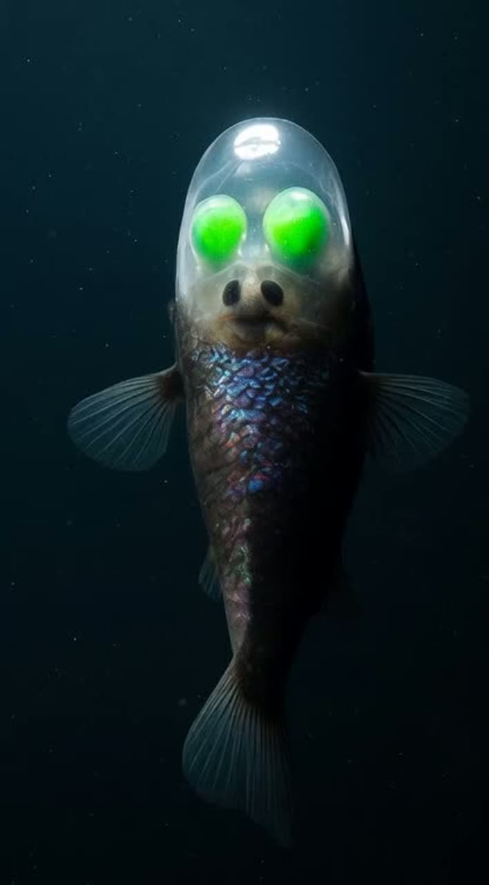 Ambient, dreamy, tropical, soft rock, 86BPM, whispering female alto vocal, electric guitar (×2), acoustic guitar, fretless bass, soft drums with brush cymbals, gentle marimba, oceanic synthesizer pad, smooth reverb texture; inspired by the lyrics of the barreleye fish gazing upward through transparent darkness, her voice shimmers like light refracted in deep water, guitars ripple as bioluminescent waves drift by, marimba echoes like distant sonar, and every note breathes the silence of the deep where life glows unseen yet eternal