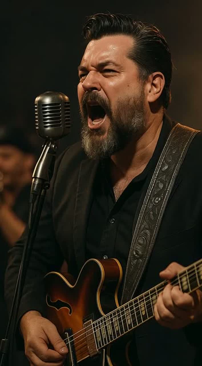 Live concert, rockabilly, gothic rock, minor key, 164BPM, powerful male baritone vocal with live shout chorus, twin electric guitars (×2)—one lead with heavy reverb slides and tremolo phrasing, one rhythm with raw muted riffing; electric bass driving a dark slap groove; Hammond organ swelling with gothic undertones; trumpet piercing through with sharp melodic cries; Latin percussion (congas, bongos, timbales, güiro, cajón) weaving an organic pulse—cajón forming the heartbeat, congas deep and resonant, bongos snapping between beats, timbales slicing metallic accents, and güiro whispering rhythmic breath, The atmosphere surges in crimson and violet light, where the baritone voice commands the crowd with raw obsession and devotion, every note trembling between love, lust, and ruin
