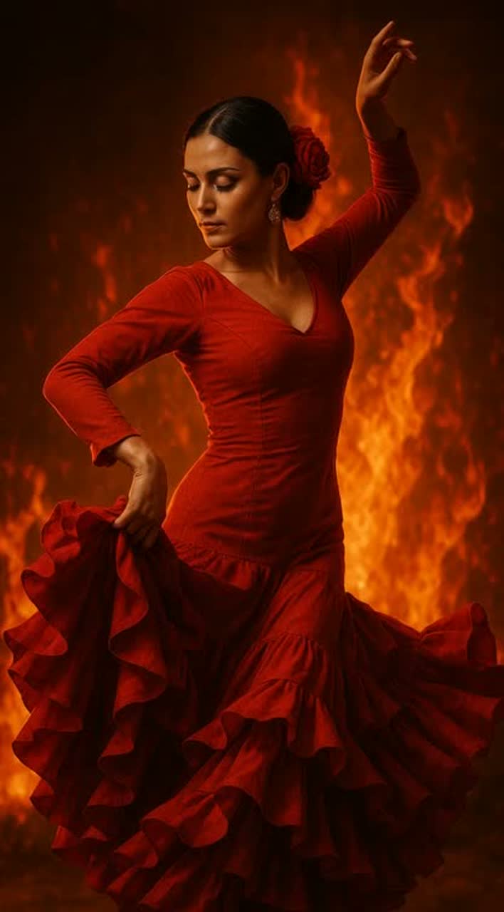 Flamenco rock, minor key, 148BPM, intense and husky female alto vocal, flamenco guitar, virtuoso acoustic guitar, percussive acoustic guitar, rhythm acoustic guitar, castanets undulating like ocean waves, powerful passionate shouts; rhythm burns with fierce emotion as guitars intertwine like living fire, each strum and clap echoing destiny’s pulse, her husky voice dances within the blaze of love and life, glowing with sensual heat and unstoppable energy