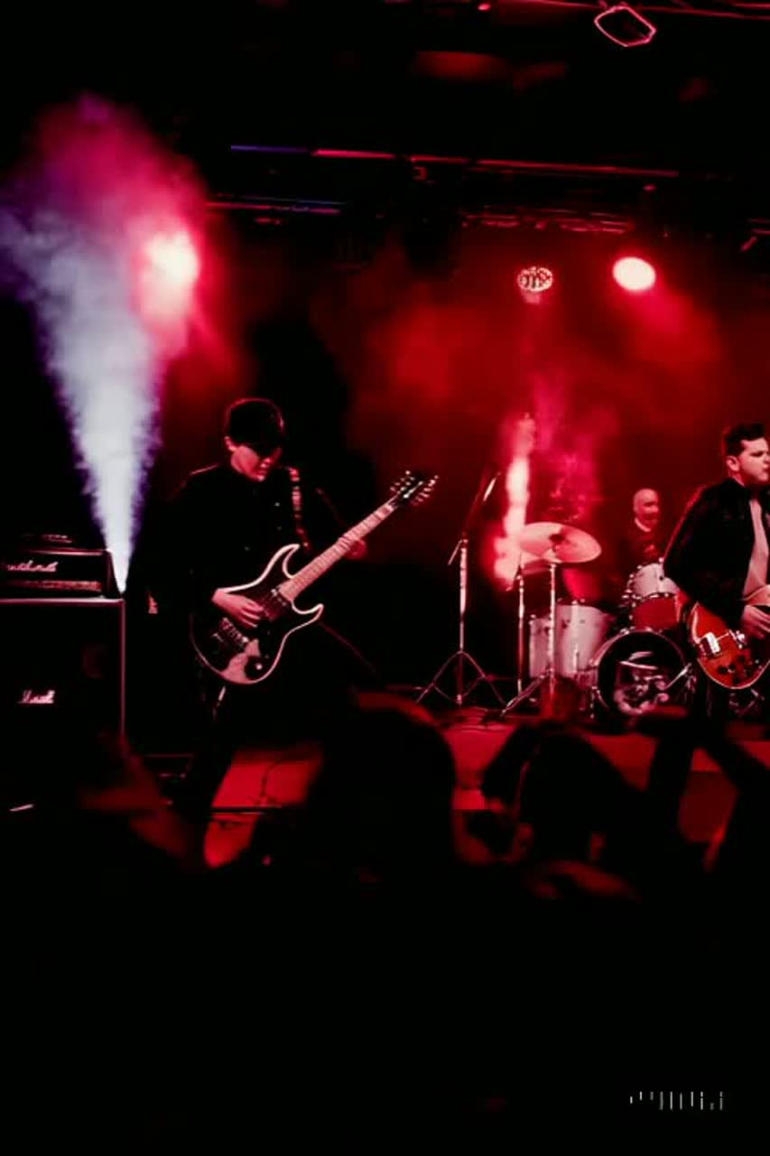 Live concert, live audience, rockabilly, gothic rock, minor key, 160BPM, powerful male baritone vocal, live shout chorus, twin electric guitars (harmonized riffing and glissando runs), electric bass (driving slap and walking lines), trumpet (bright high-register stabs and long sustains), conga and bongo (interlocking syncopation), timbales (flashing rolls on every break), cajón (deep resonant heartbeat groove), and güiro (sharp rhythmic scratches), The arrangement blooms with vivid stage energy—an eruption of rhythm and brass, guitars wailing like sirens of victory, percussion shimmering in constant motion, celebrating the endless spirit of rock in full color