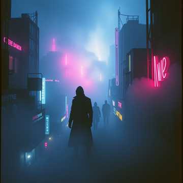 "Futuristic electronic with industrial noise, synthwave, and dark hip-hop, Heavy bass, chaotic beats, and atmospheric drones create a gritty, dystopian vibe, perfect for cyberpunk and shadowrun themes