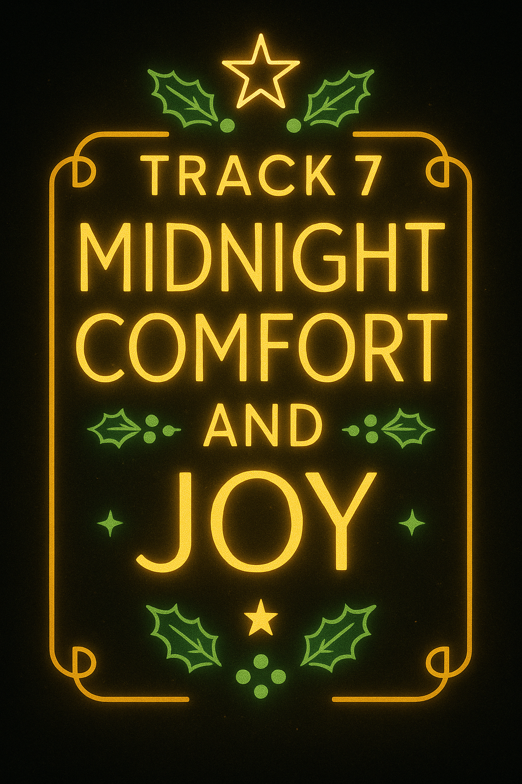 Dark and dramatic electro-swing Christmas track at 124 BPM, inspired by the traditional minor-key feel of classic winter carols, Blend vintage swing rhythms with mysterious modern electronic textures, creating an elegant midnight mood, Vocals should be expressive and storytelling-focused, using original lyrics about comfort, joy, and spiritual warmth in the winter night, The atmosphere should feel like a timeless carol transformed into a stylish electro-swing piece echoing through a neon-lit speakeasy at midnight—moody, festive, and full of holiday depth