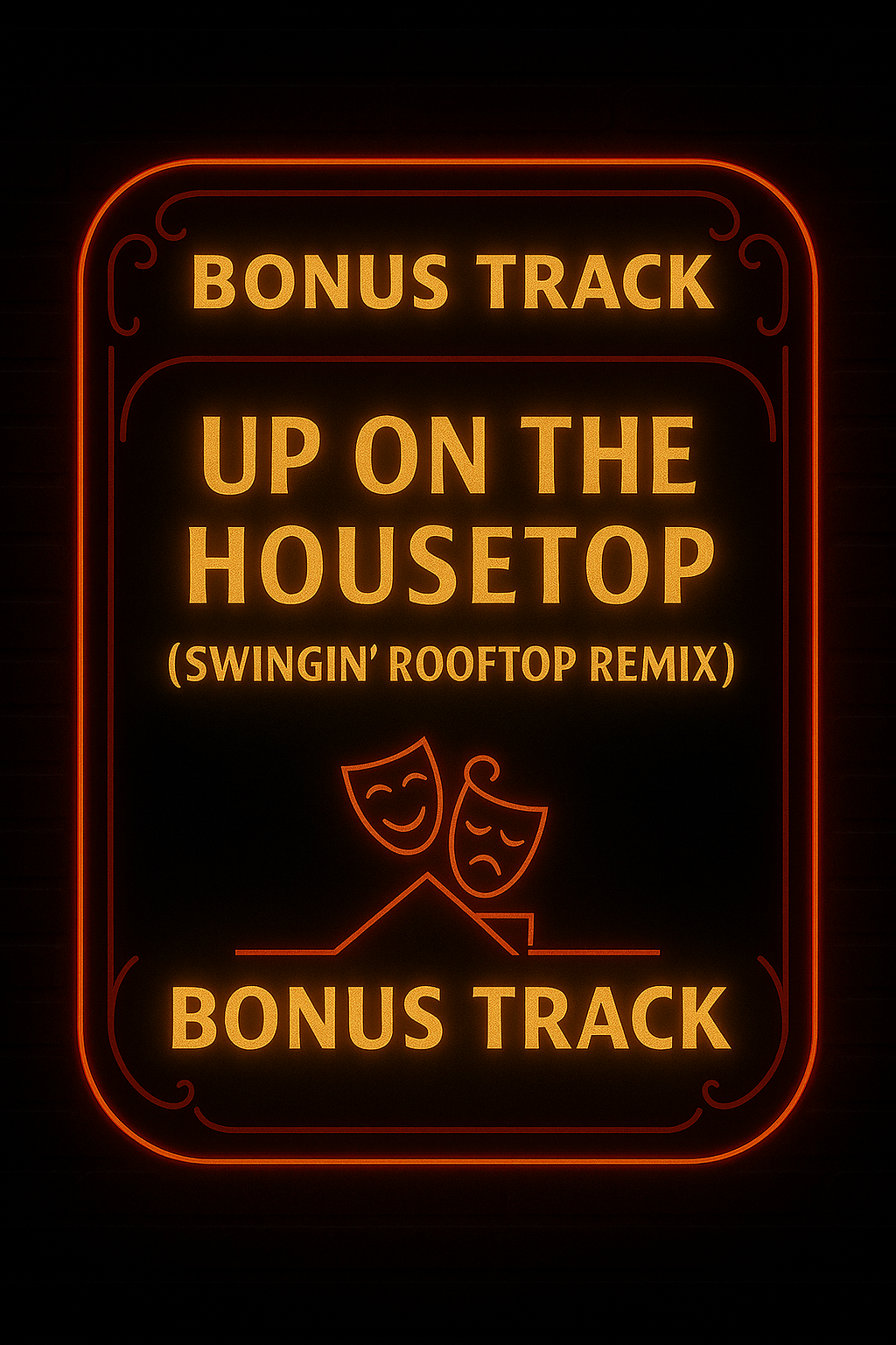 Upbeat electro-swing Christmas remix at 132 BPM, blending vintage swing charm with bright, modern electronic energy, The mood should feel like a festive rooftop party in a snowy 1920s city—playful, mischievous, and full of holiday sparkle, Keep the vocals fun and rhythmic, singing the traditional public-domain lyrics of “Up on the Housetop” with lively swing phrasing, Add a warm, theatrical spoken intro and outro to create a rooftop-snowglobe atmosphere, Use bouncy swing grooves, crisp retro-inspired beats, and glittery electronic flourishes to make the track feel joyful, danceable, and full of peppermint-bright holiday spirit
