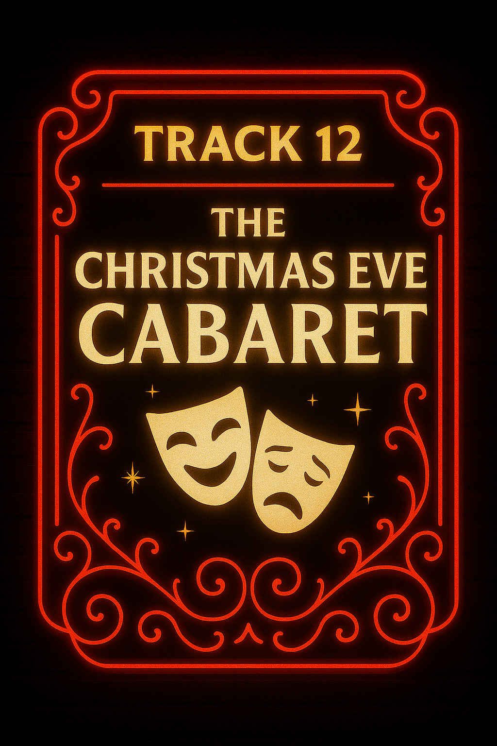 Theatrical electro-swing Christmas showpiece at 130 BPM, full of vintage speakeasy glamour and holiday sparkle, Blend lively swing rhythms with bold, modern electronic energy for a dazzling cabaret finale, The mood should be warm, festive, and dramatic—velvet curtains, glittering lights, and a snow-covered city just outside, Vocals should be expressive, charismatic, and theatrical, guiding the listener through a glamorous Christmas Eve performance, Include a big, playful swing break and a grand musical lift for the final chorus, The atmosphere should feel like a luxurious holiday cabaret full of joy, mischief, and shining winter magic
