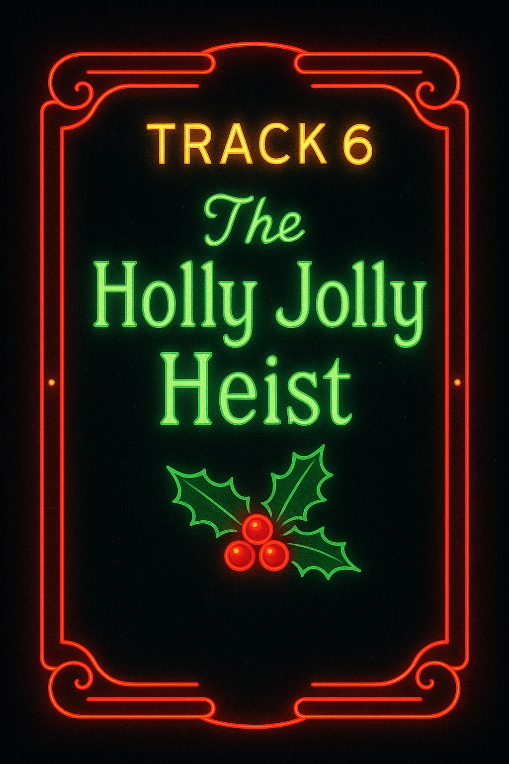 Fast-paced electro-swing Christmas caper at 128 BPM with a playful, theatrical mood, Use energetic swing rhythms, lively brass bursts, bouncy vintage-style phrasing, and modern electronic drops that emphasize the sneaking, tiptoeing, and thrill of a holiday heist, The vocals should be fun, mischievous, and story-driven, capturing the excitement of two partners pulling off a lighthearted Christmas caper inside a 1920s-style winter speakeasy, The sound should blend upbeat vintage swagger with crisp modern production, creating a whimsical, cinematic, festive adventure full of charm and holiday mischief