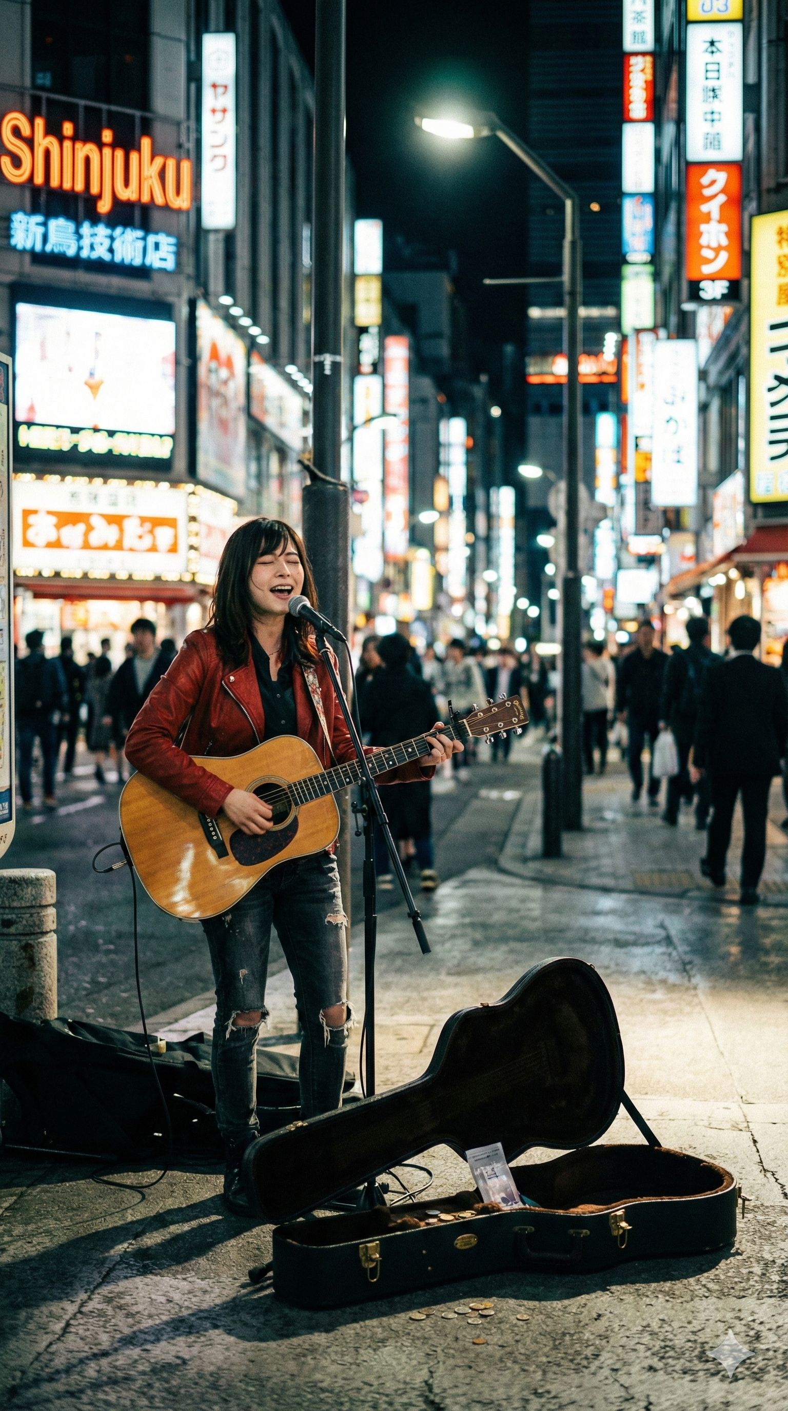 Acoustic J-Rock, Street Performance, Busking, Raw Female Vocals, Shinjuku Night Atmosphere, Live Recording, Unplugged, Emotional, Folk Punk, Aggressive Acoustic Guitar, Fast Tempo, Foot Stomp, Minimalist Arrangement, Passionate, Edgy, Clear Diction, Instrumental, No Vocals, Melodic Techno, Driving Beats, Complex Lead Synthesizer, Virtuosic Electric Guitar, Lyrical Guitar Phrasing, High Fidelity, Studio Mix, Cinematic Build-up, Deep Bass, Clear Production, ‑electric guitar, ‑synthesizer, ‑heavy metal, ‑edm, ‑trap beat, ‑auto-tune, ‑overproduced, ‑full orchestra, ‑brass section, ‑smooth jazz, ‑studio perfection, ‑vocals, ‑voice, ‑singing, ‑choir, ‑humming, ‑ad-libs, ‑breathing, ‑spoken word, ‑rap, ‑vocal chops, ‑acapella, ‑background vocals, ‑crowd noise, ‑audience, ‑sighing, ‑whispering
