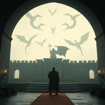 Epic Folk-Rock with Nordic Choir, Powerful, accoustic guitar, slow violin chants, eearie sounds of dragons in background