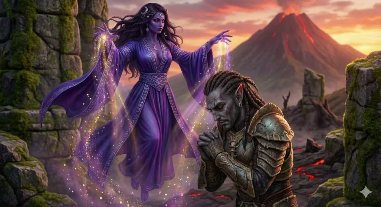 Slow sacred Dunmer temple hymn to Azura in 4/4, 85 BPM, Low strings and steady drone, soft hand drums, subtle tambura-like textures, occasional flute, no modern synths, no rock, Mixed male and female choir in mostly unison or simple harmonies, with one gentle lead voice carrying the verses, Very reverent, Morrowind-like atmosphere, twilight mood, [Intro - whispered, spoken] and [Outro - Spoken] are dry, quiet speech; all other lines fully sung, Use my section tags and lyrics exactly
