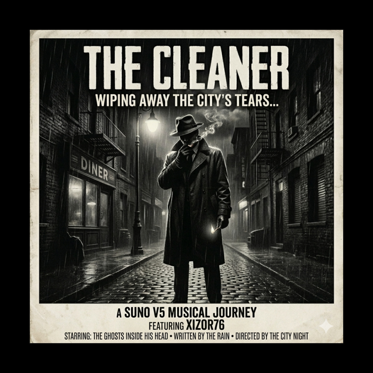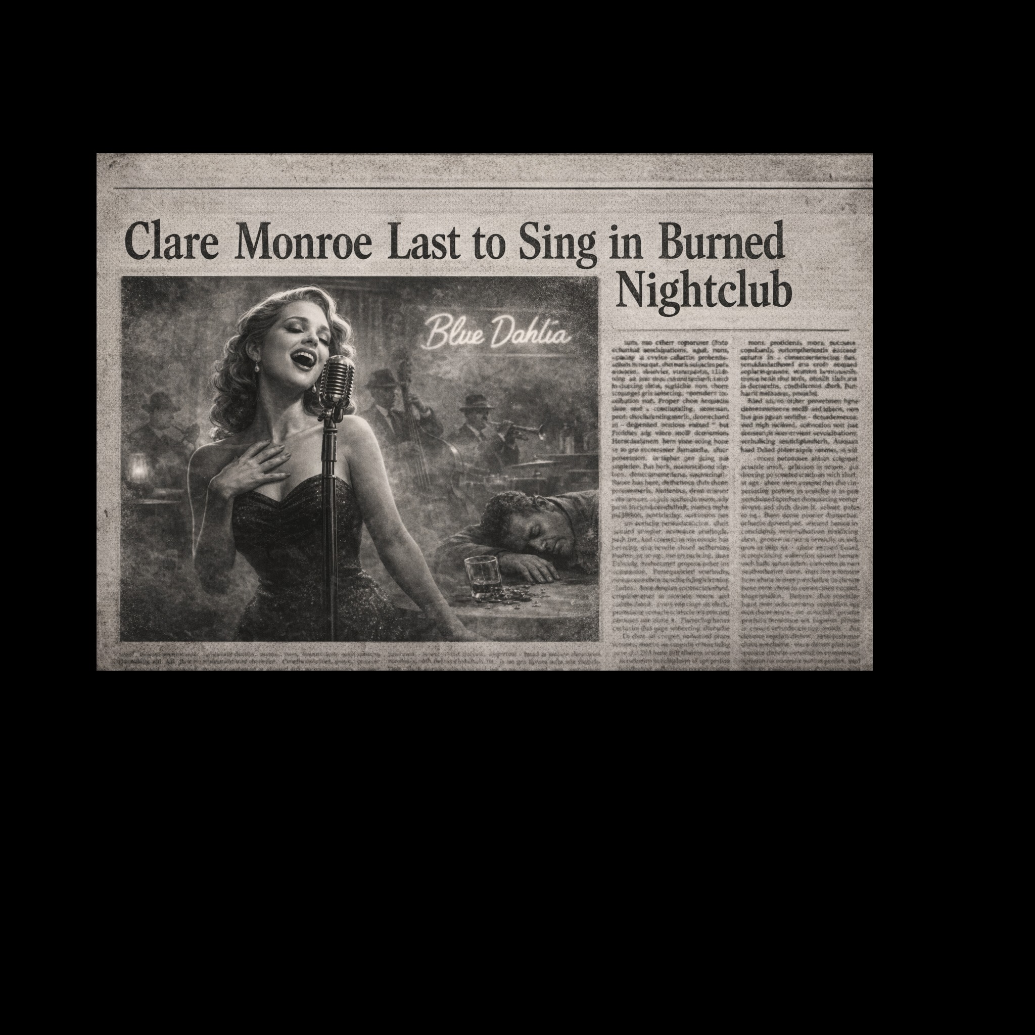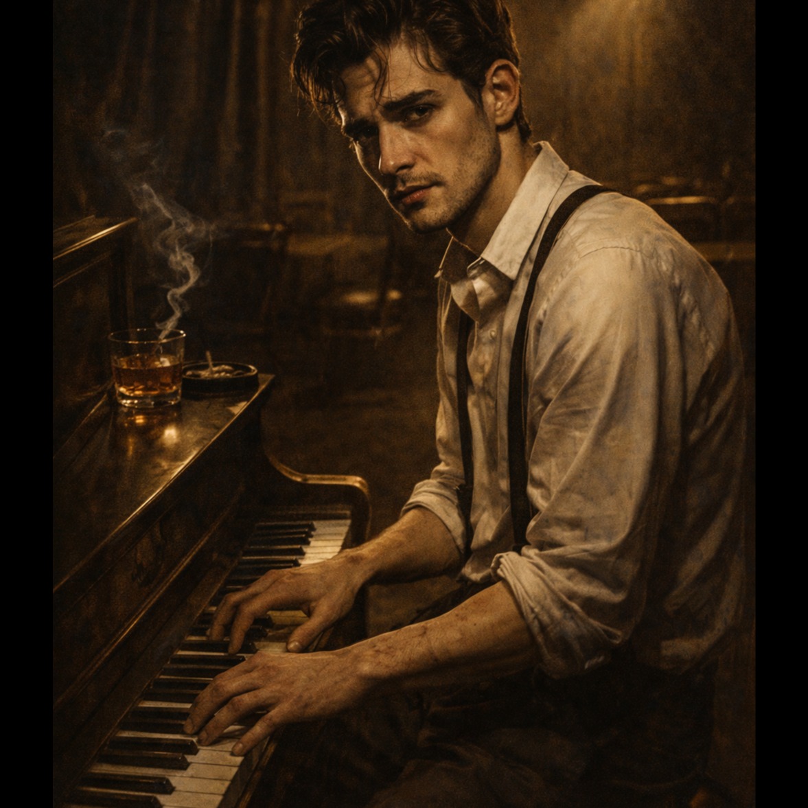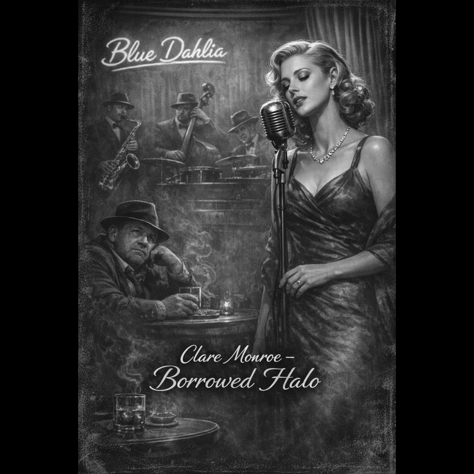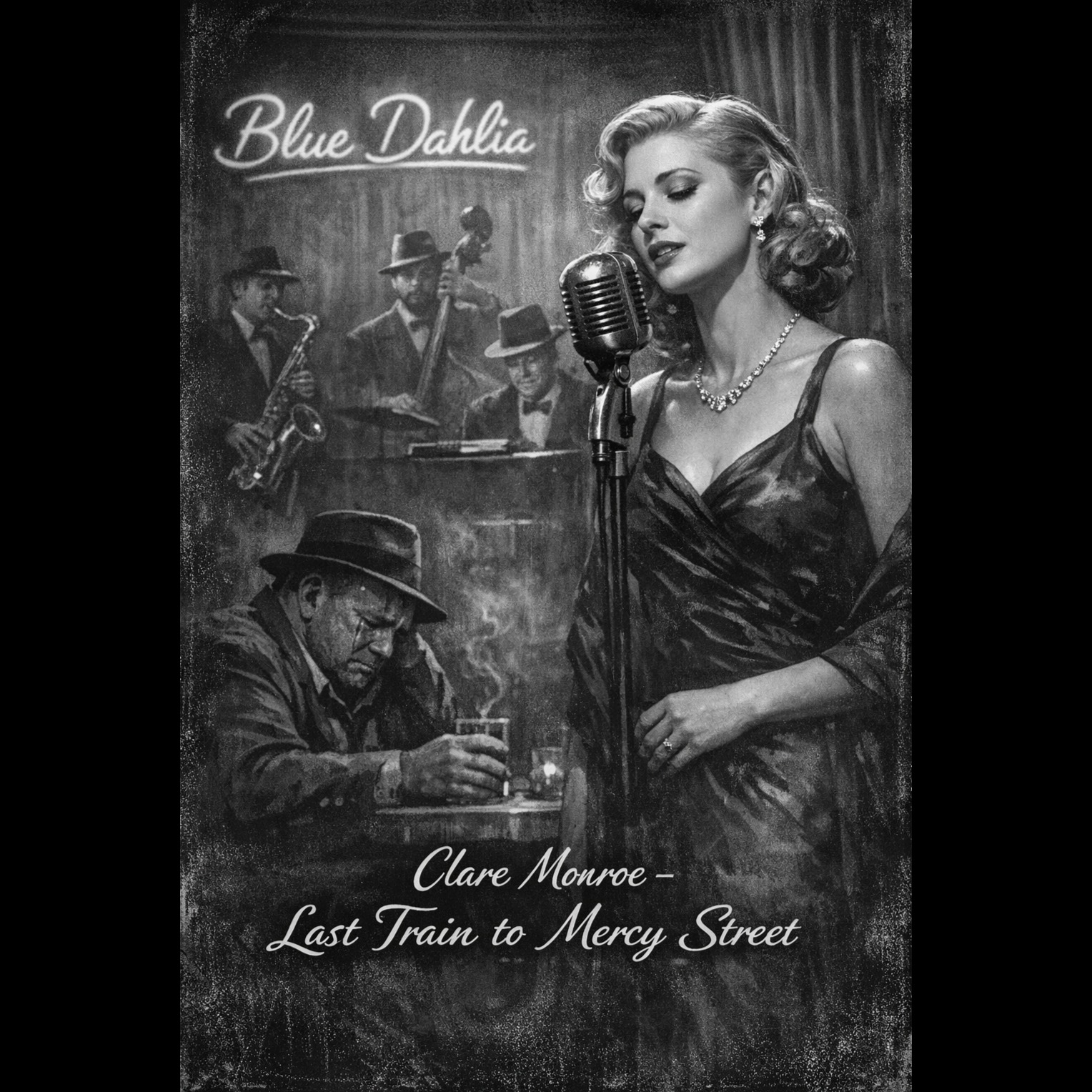 A slow, noir jazz piece opens with upright bass walking softly in a minor key while brushed drums create a lazy, late-night pulse, Smoky male crooner vocals glide over faded piano and haunting guitar voicings, Bluesy saxophone solo emerges mid-song, soaked in vintage lo-fi grit, wrapping the cinematic, shadowy lounge atmosphere in authentic 1940s texture