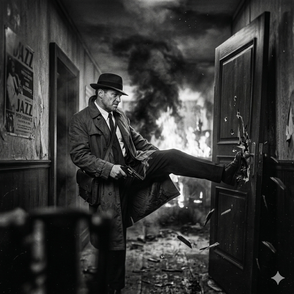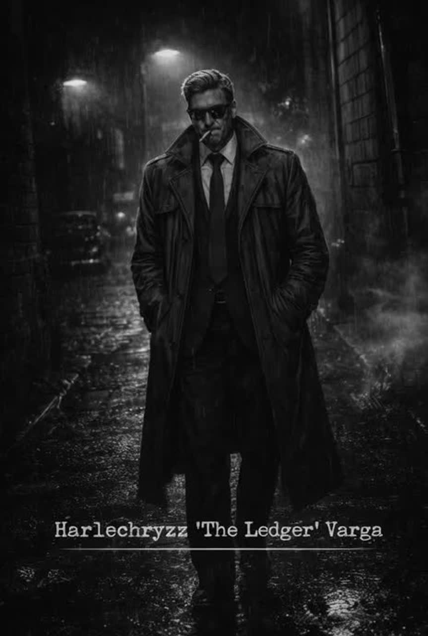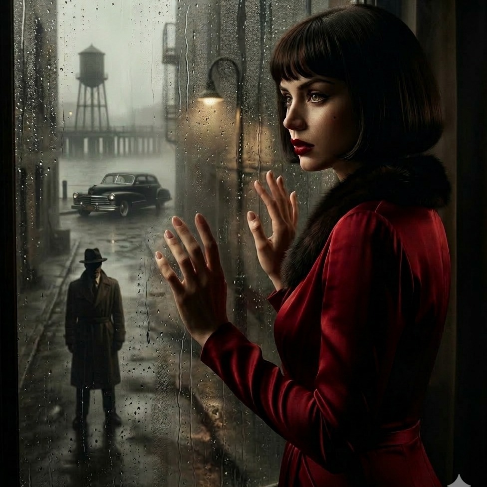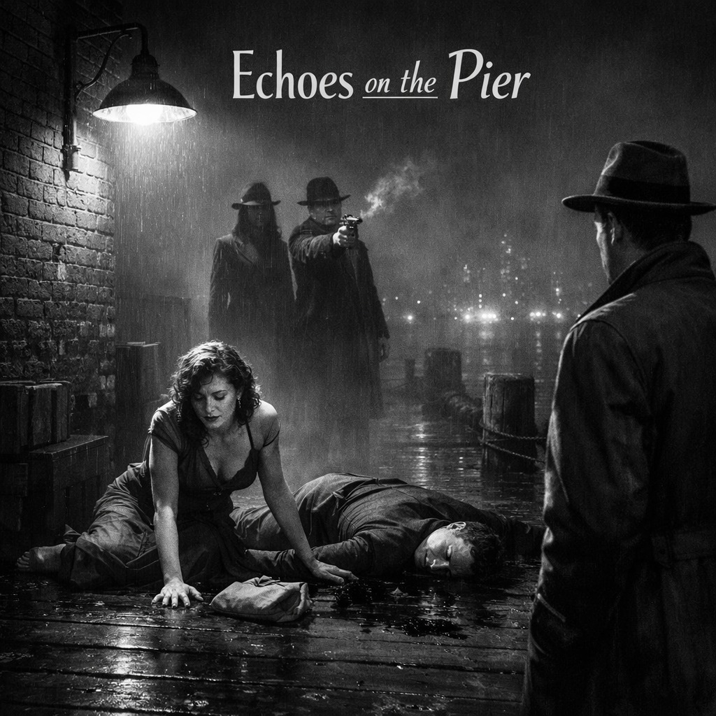 A 1940s film-noir jazz ballad at 74 BPM in F minor, blending classic smoky jazz club atmosphere with dramatic orchestral film scoring, Baritone sax introduces a dark harbor motif while muted trumpet echoes like distant foghorn calls, Upright bass and brushed drums create a slow swing groove beneath sparse piano voicings, Low orchestral strings add suspense and tension during the early sections, In the first chorus, a dramatic orchestral hit follows the lyric “one bullet breaks the night, ” after which the entire ensemble briefly falls silent before a lonely trumpet echo resumes the melody, This moment simulates a gunshot echoing across the harbor, From the bridge onward the harmony softens and warms, introducing vibraphone shimmer and fuller brass textures as hope returns when Vivian survives, The male vocal is delivered in a deep noir baritone with restrained vibrato, narrating the scene like a detective reflecting on a night that almost ended in tragedy