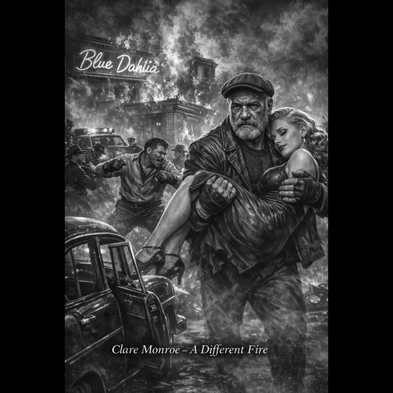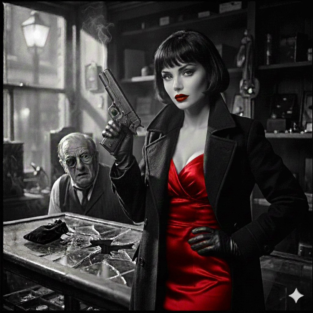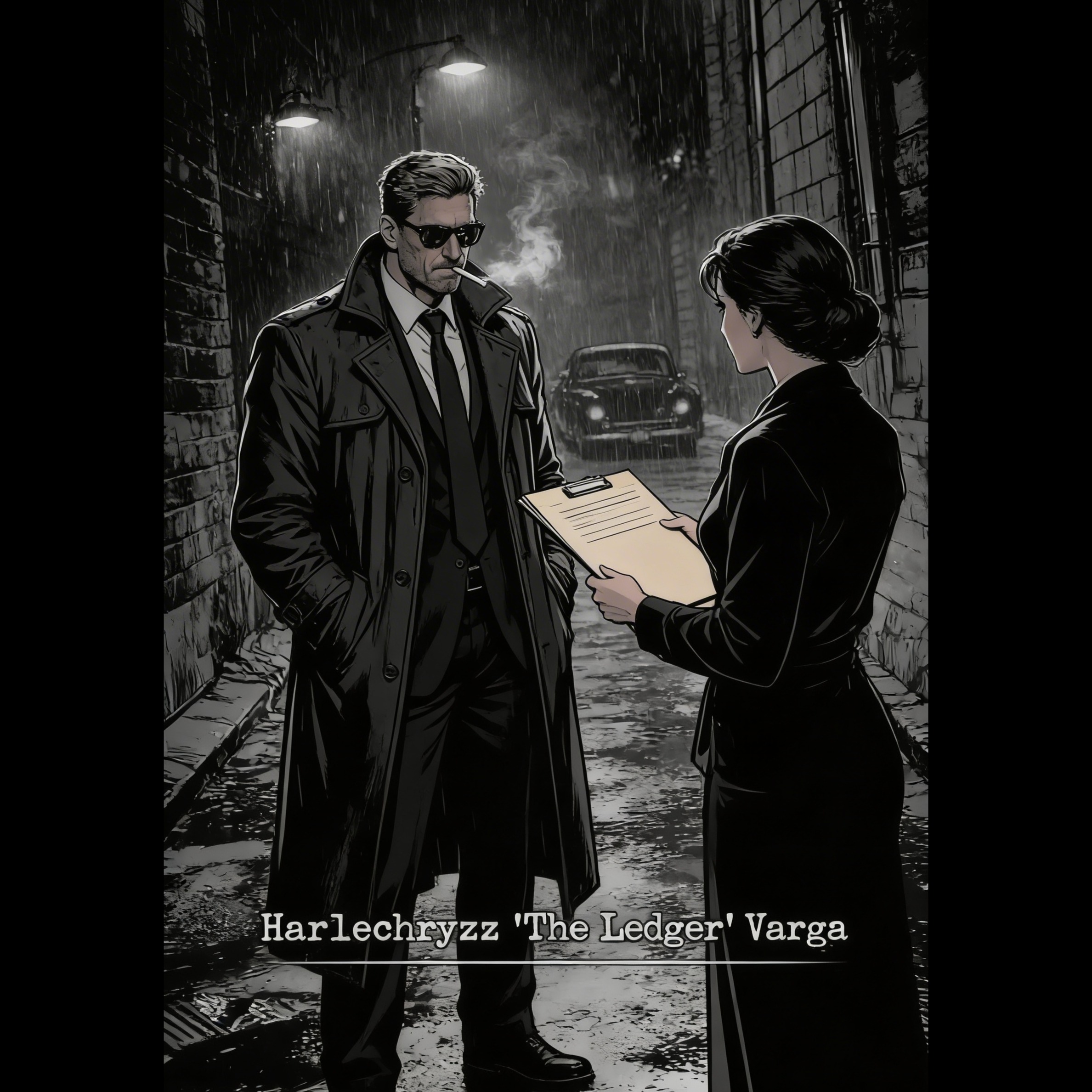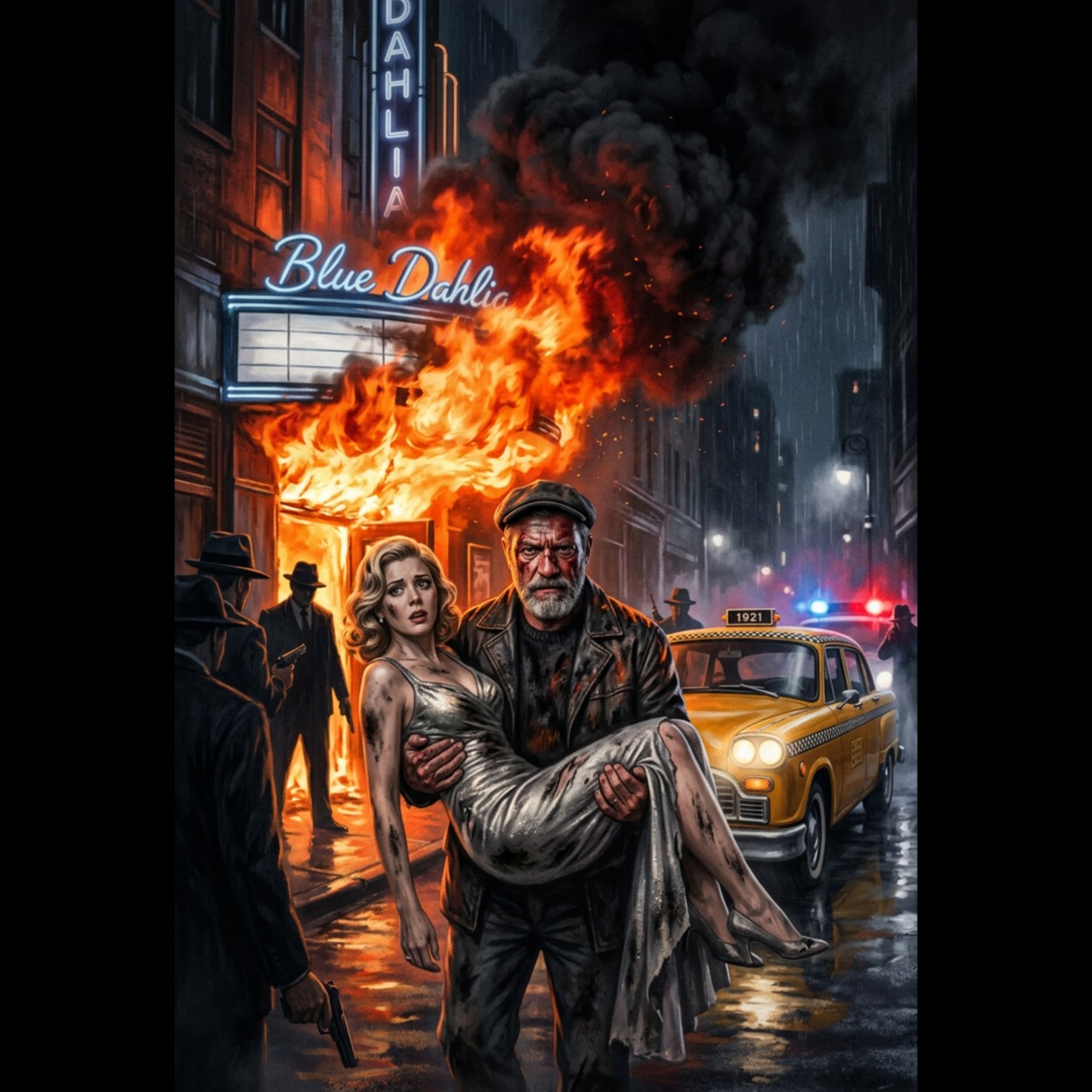 A 1940s film-noir jazz ballad at 74 BPM in F minor, blending classic smoky jazz club atmosphere with dramatic orchestral film scoring, Baritone sax introduces a dark harbor motif while muted trumpet echoes like distant foghorn calls, Upright bass and brushed drums create a slow swing groove beneath sparse piano voicings, Low orchestral strings add suspense and tension during the early sections, In the first chorus, a dramatic orchestral hit follows the lyric “one bullet breaks the night, ” after which the entire ensemble briefly falls silent before a lonely trumpet echo resumes the melody, This moment simulates a gunshot echoing across the harbor, From the bridge onward the harmony softens and warms, introducing vibraphone shimmer and fuller brass textures as hope returns when Vivian survives, The male vocal is delivered in a deep noir baritone with restrained vibrato, narrating the scene like a detective reflecting on a night that almost ended in tragedy