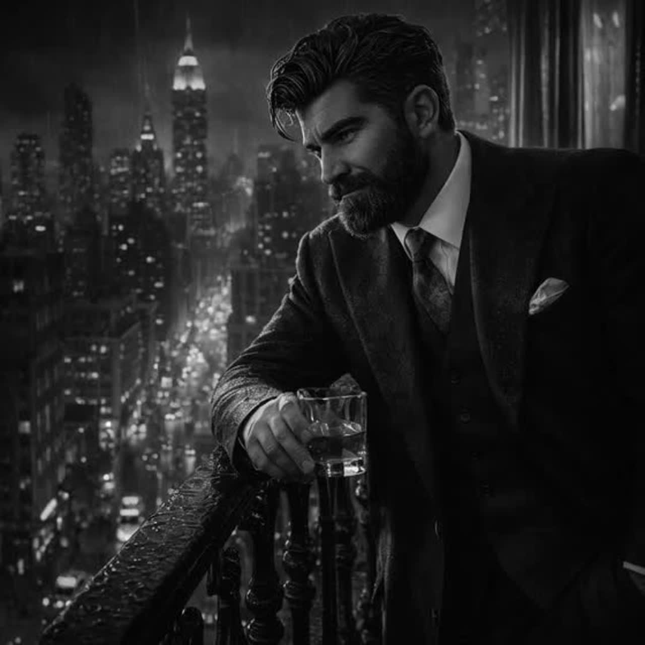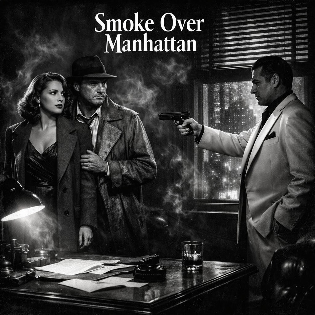 Style: 1940s film noir crooner, smoky post-war New York nightclub, male baritone vocal, intimate but commanding, elegant and dangerous, cinematic big band jazz, slow swing, muted trumpet, brushed drums, upright bass, piano, subtle saxophone, velvet nightclub ambience, late-night confession energy, dramatic rise into powerful chorus, dark romance, tension, secrecy, guilt, polished vintage recording feel, rich room reverb, emotionally explosive but controlled, like a man singing with a loaded secret in his throat