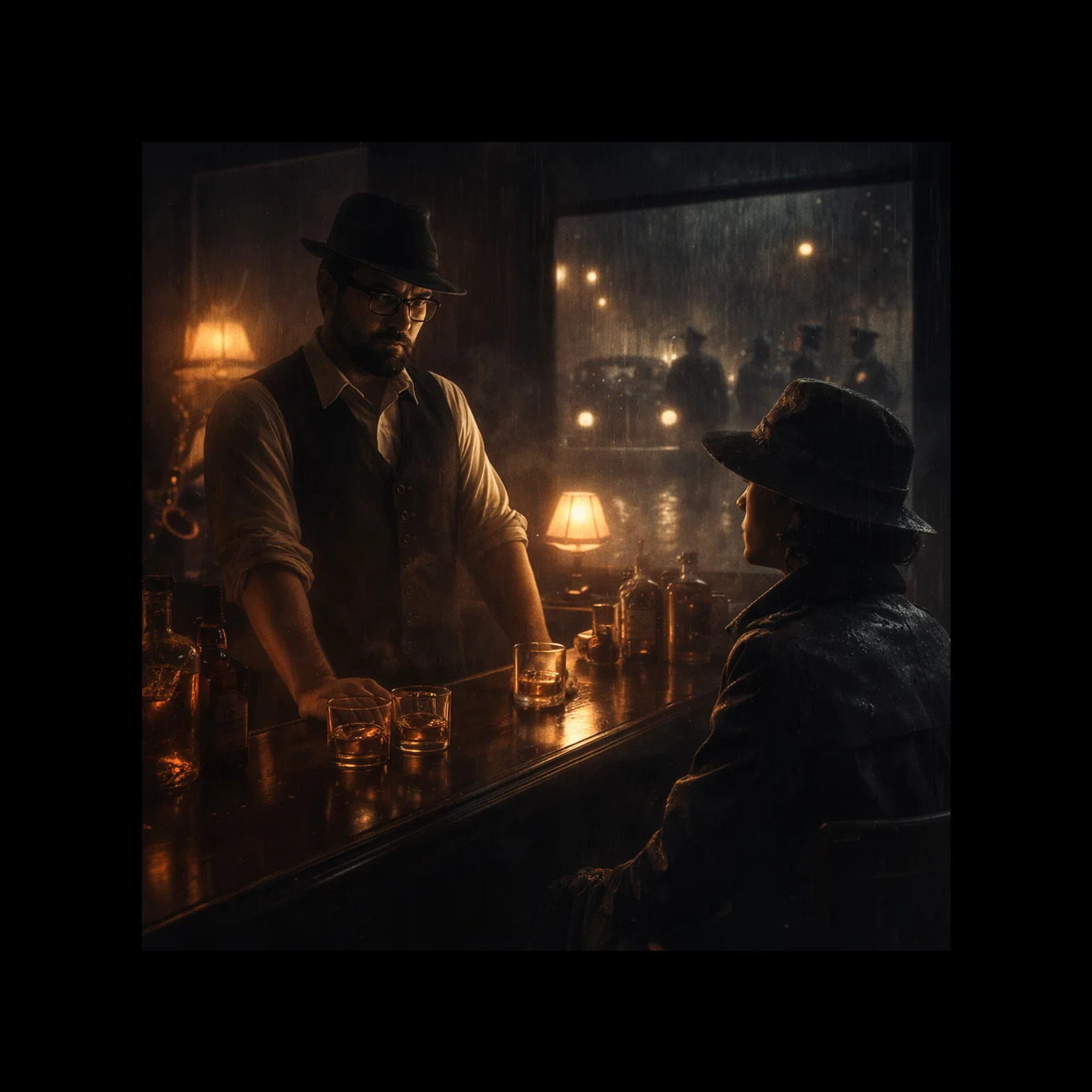 slow vocal jazz, 1940s film noir, rainy night, smooth male crooner, smoky female vocals, duet, muted trumpet, slow saxophone, upright bass, acoustic piano, sorrowful, cinematic, gritty