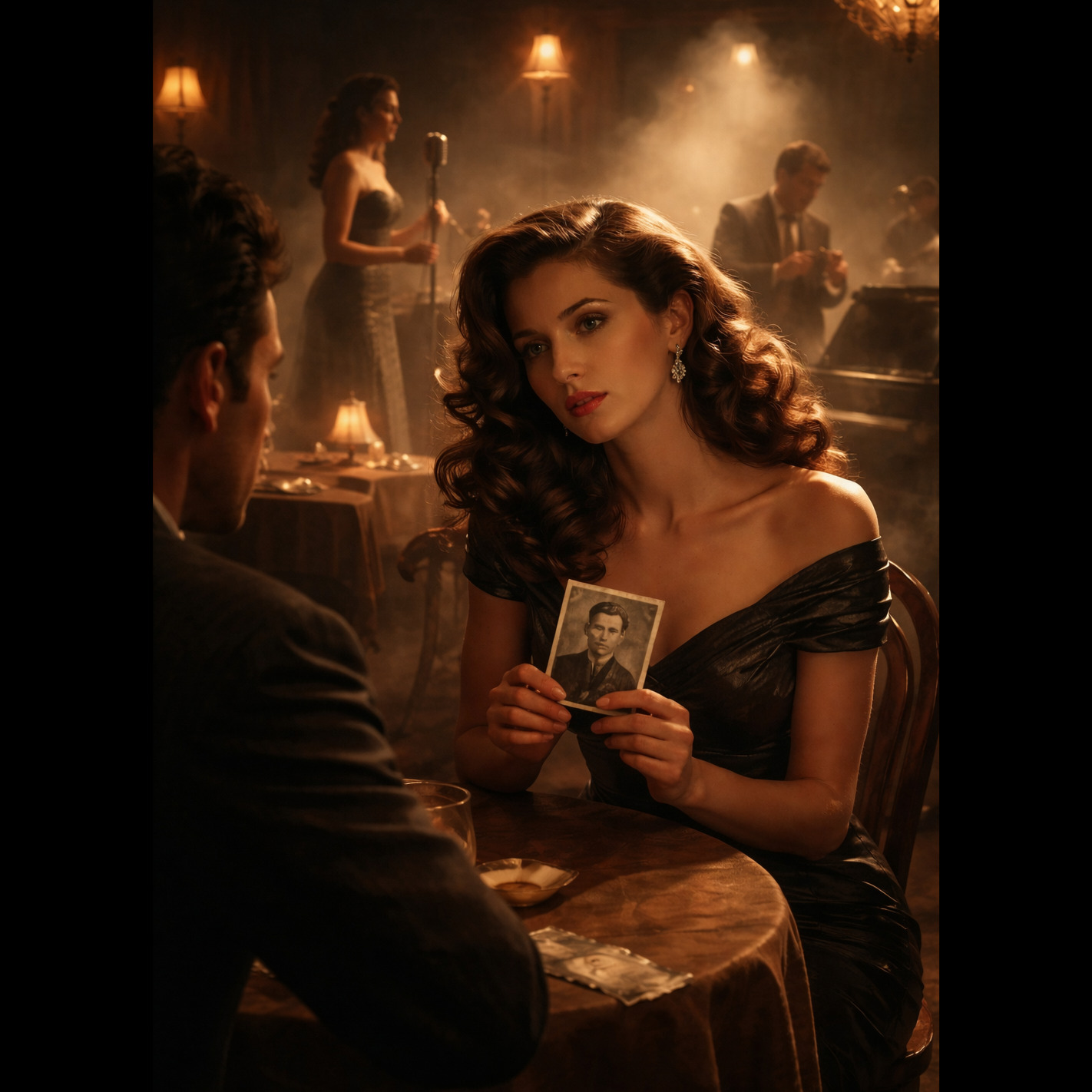live 1940s film noir live club performance french chanson dark jazz high quality, Begins with immersive sound design featuring a crowded smoky jazz club with clinking glasses, A realistic radio play spoken word intro features an insecure nervous female voice speaking hesitantly into a live microphone addressing the audience with a heavy french accent, A melancholic accordion and upright bass slowly enter transitioning into a slow jazz waltz rhythm with soft brush drums, The chorus is an emotional sweeping torch song vocal sung entirely in French acting as her stage performance, The instrumental solo features a crying accordion dueling with a muted jazz trumpet, A mid song spoken word section acts as a secretive internal monologue, The bridge strips the instrumentation down to a tense upright bass before building into a powerful dramatic final French chorus supported by subtle brass, The track concludes with a cinematic fade out blending slow jazz with live audience applause
