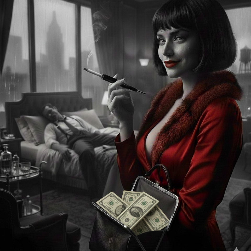 1940s film noir dark jazz torch song high quality swing, Starts with a slow upright bass and seductive saxophone setting a moody cinematic atmosphere, Transitions into a spoken word sequence over a soft jazz piano, The first verse introduces a smoky sultry female vocal accompanied by soft brush drums and a muted trumpet, The pre-chorus builds tension with rising piano chords and a steady walking bass line, The chorus opens up into a full slow swing band arrangement featuring expressive powerful vocals and subtle seductive backing harmonies, The second verse returns to a stripped back bass and drum groove for intimate storytelling, A wailing melancholic saxophone solo takes over the middle section providing a smoky and dangerous vibe, The bridge drops down to almost silence with just a quiet tense upright bass and piano highlighting the vocal delivery, The final chorus swells with maximum emotional intensity and brass before transitioning into a quiet mysterious jazz outro, Length: 5:00