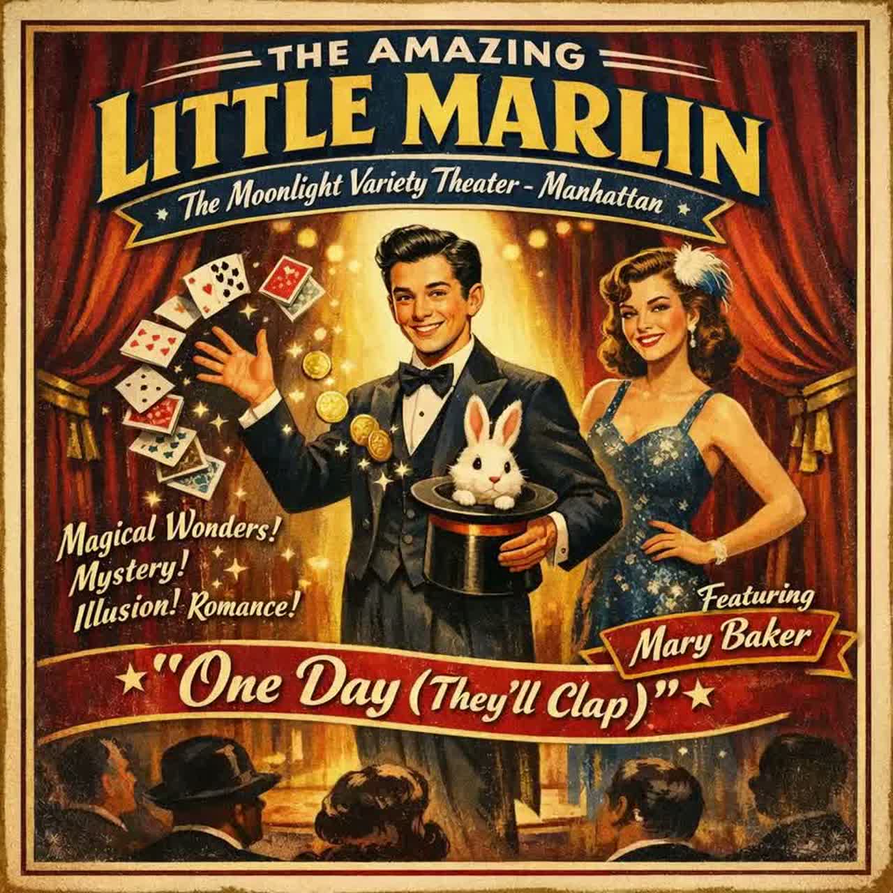 1946 new york swing big band crooner style upbeat vintage jazz storytelling song about a young stage magician performing in a small manhattan theater male crooner vocal with playful charm similar to classic Traditional pop, Jazz, Swing, Big band bing crosby era delivery swing rhythm section with upright bass brushed drums piano comping and walking bass line bright brass section trumpets trombones and lively saxophones answering the vocals occasional clarinet flourishes and vibraphone accents for magical atmosphere light theatrical callandresponse backing vocals during chorus energetic jumpswing groove around 160 bpm with playful brass hits and comedic timing mood joyful magical triumphant nostalgic new york nightlife song structure intro verse verse chorus verse chorus bridge final chorus outro