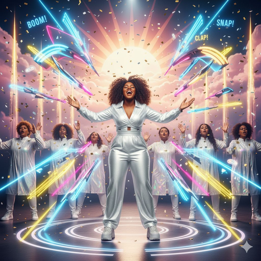 Bright modern electro-pop soul with rich gospel enhancement, 6-minute tempo unchanged, Powerful female lead with rhythmic melisma, octave jumps, belting, playful whistle ad-libs, Full choir for call & response, layered harmonies, dynamic crescendo (“Hallelujah”, “Sky!”, “love~”, “God loves You”), Ultra-tight drums, snappy handclaps, tambourine sparkle, punchy sidechained bass, funky guitar chanks, shimmering piano, airy pads, organ stabs, brass hits, uplifting strings, Hooks emphasized with “boom! clap! snap!” and subdivided rhythmic phrasing, Joyful, euphoric, loving, spiritual vibe: “we love each other” and “God loves you” naturally expressed, Full dynamic build from soft verse to explosive chorus, wide stereo field, ultra-clear transients, sparkling highs, modern pop-gospel polish, Suitable for remix; high-end choir, organ, strings; festival arena energy; ultra HD for Suno V5