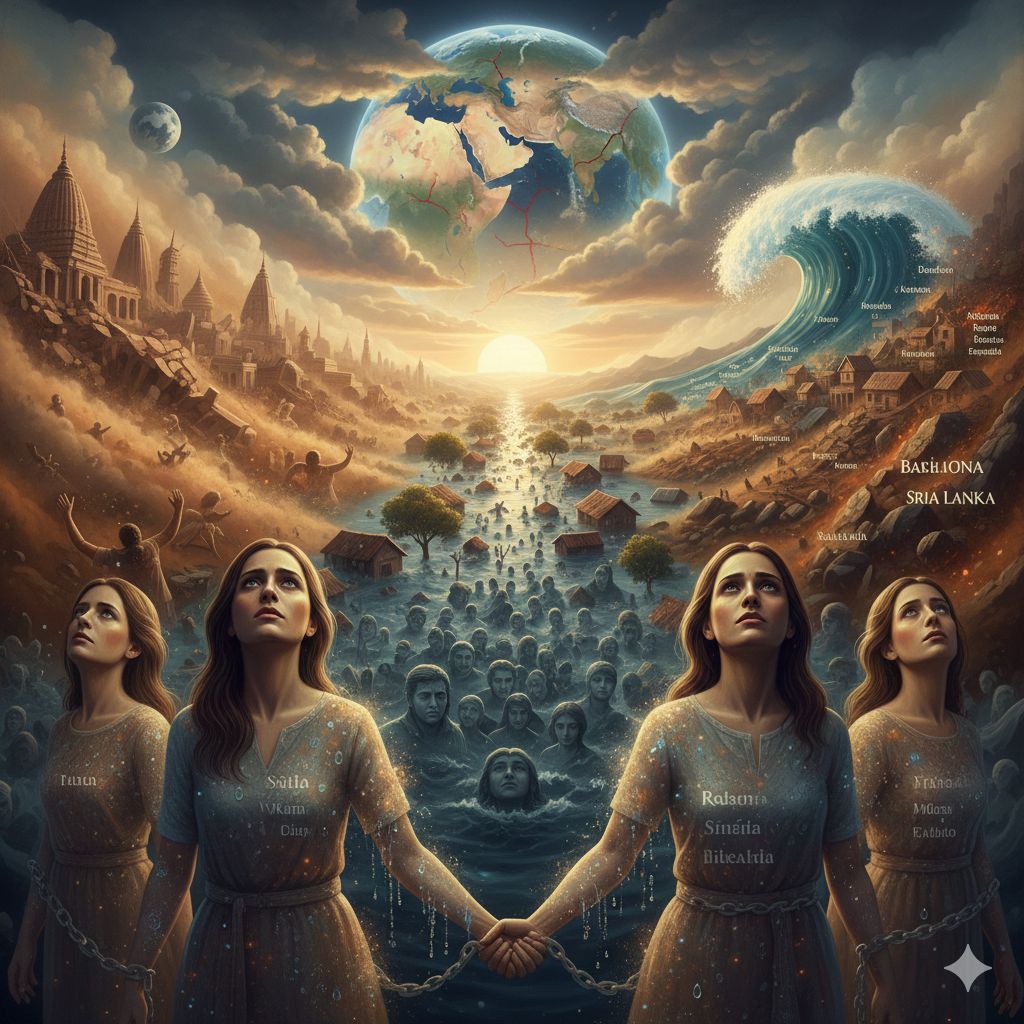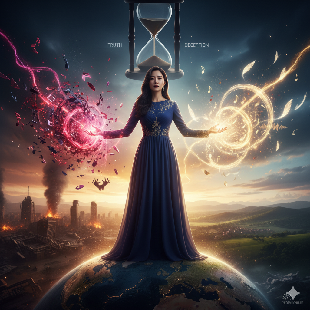 cinematic epic pop, ultra-high fidelity, female 3-part harmony, burdensome news-disaster theme, immersive, high tension, strong hook, breathy & punchy lead, clear diction, numbers emphasized, word-by-word clarity, maximal hook, dynamic breathing, high emotional impact, orchestral strings, piano/harp arps, cinematic synth pads, full cinematic percussion, sub-bass pulse, ambient flood/typhoon/thunder FX, echo/delay on hook, pad swells, high-harmonic vocal layers, micro-details in breaths, verse 85-95bpm, pre-chorus 95-105bpm, hook/chorus 110-120bpm, syncopated kick/snare/hi-hat, driving sub-bass, repeated hook emphasis, layered harmonies, ultra-clean mix, wide stereo field, spatial reverb/delay, immersive crescendo, Korean-English bilingual lyrics, numerical phrases in English, scene immersion, burdensome imagery, English [] notes only, 6min structure: intro→verse→pre→hook→verse2→bridge→hook2→verse3→bridge2→final hook→outro