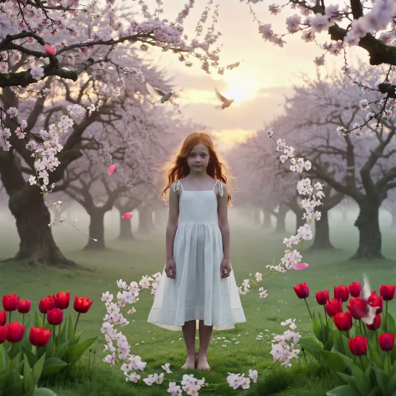 Russian new-folk with European folk elements, gentle spring mood, tender joyful atmosphere, expressive accordion, soft fiddle melodies, Celtic harp accents, light acoustic guitar strumming, airy wooden flute, subtle tambourine rhythm, warm upright bass, delicate choral harmonies, blooming meadow feeling, graceful round dance energy, bright major key, mid-tempo flowing groove, pastoral cinematic vibe