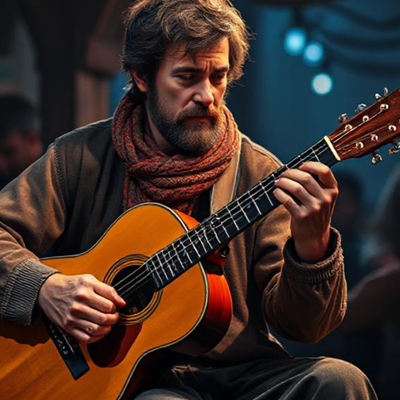 Fulfillment style: male vocals with an expressive presentation, emotional intonation, with elements of passion and drama, Tools: acoustic guitar, gypsum violin, light gypsy rhythm, clips (rhythmic pops), castanets or table bacgound in the second lende and chorus are possible, Temp: medium (free rhythm, deceleration and acceleration for emotional accent are allowed)