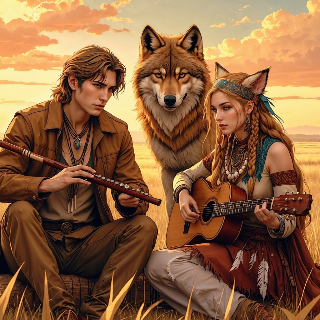 Western Folk, Sioux Music, Male and Female Vocal Duet, Soulful, Traditional Native Drums, Ethereal Chanting, Acoustic Guitar, Soulful Violin, Melancholic Flute, Layered Harmonies, Rhythmic Percussion