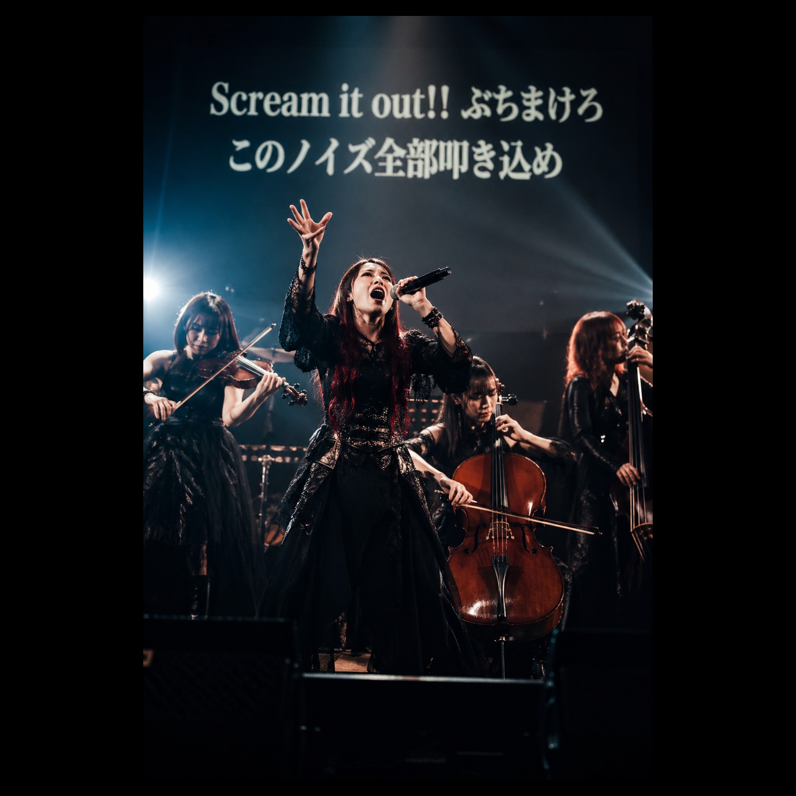 live concert, dramatic pop, classical fusion, minor, 132 BPM, female quartet chorus, live shout chorus, call and response, electric violin(pizzicato, legato), electric viola(legato), electric cello(staccato), electric double bass(arco), intense rebellious emotional release with explosive vocal energy