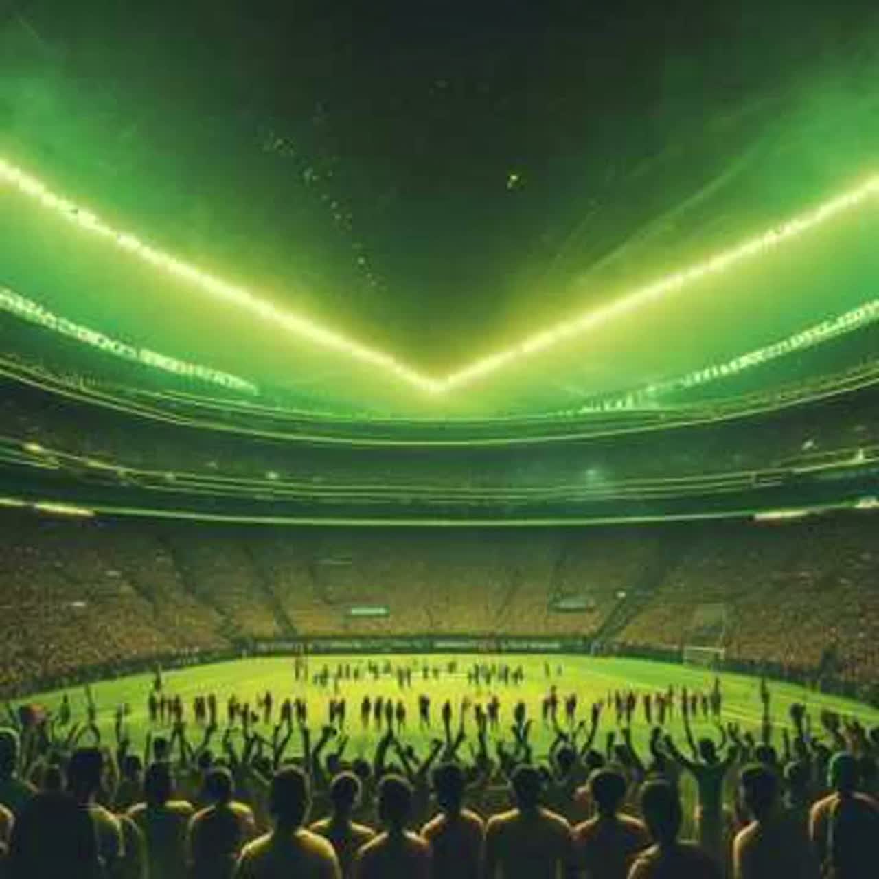 Samba moderno com batida eletrônica, percussão de arquibancada, pandeiro e surdo marcados, coro de torcida, energia festiva e contagiante, clima de estádio, groove brasileiro acelerado, refrão explosivo e repetitivo, vibe de música viral de Copa do Mundo