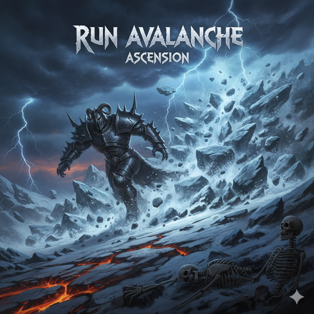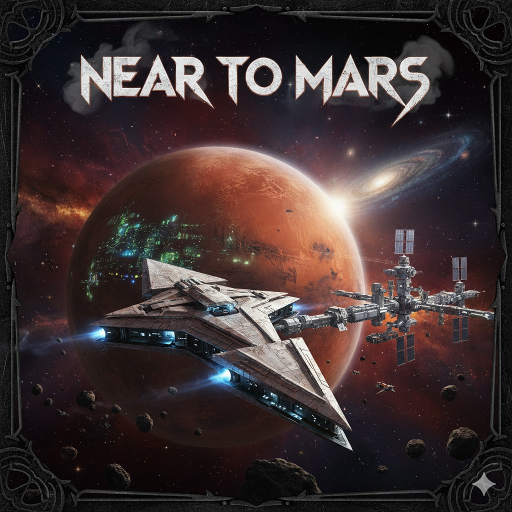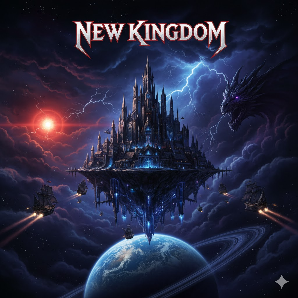 opens cinematically with drums, dark synth pads, lead guitar and Superstrat setting a grand atmosphere An energetic heavy metal track with a dramatic, galloping rhythm driven by twin electric guitars and dynamic bass lines, The verse alternates tension with melodic leads, building to explosive choruses and harmonized guitar solos, The track features atmospheric clean sections to contrast the intensity, with thundering drums and soaring vocals throughout
