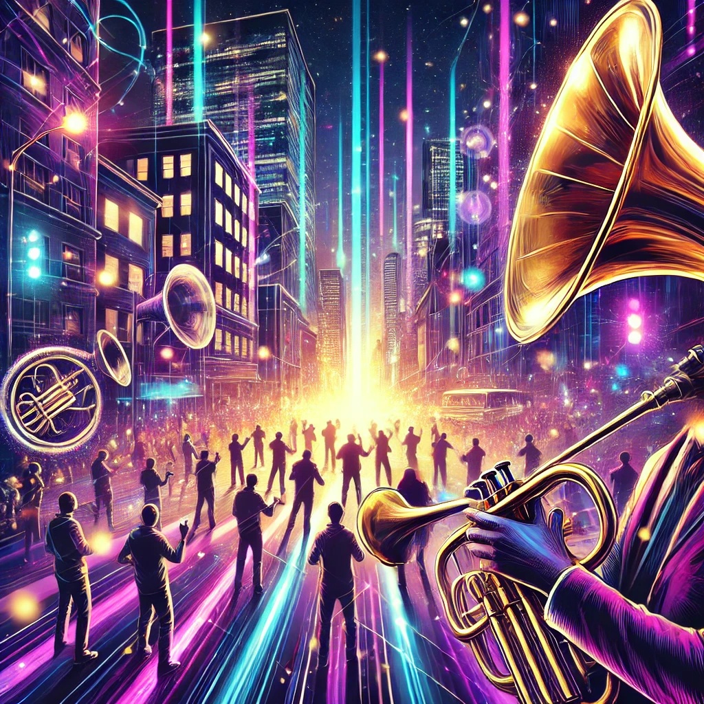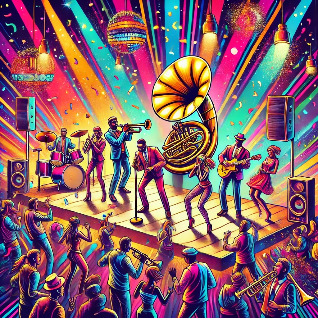 French House, Brass Band, Funky, Groovy Horns, Retro Vibes, Catchy Synths, Powerful Bassline, Upbeat, Danceable, Layered Percussions, Party Energy, Vibrant, Electric Guitar