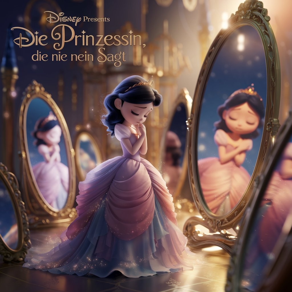 A Disney princess ballad in German opens with elegant piano and harp, joined by delicate woodwinds and glockenspiel to create a magical orchestral palette, Cinematic strings swell through the verses, peaking in an emotional crescendo with a full orchestra, The atmosphere subtly shifts as brooding low strings and eerie sound design introduce a dark, horror-tinged outro, culminating with chilling orchestral stabs beneath sampled or acted doctor dialogue
