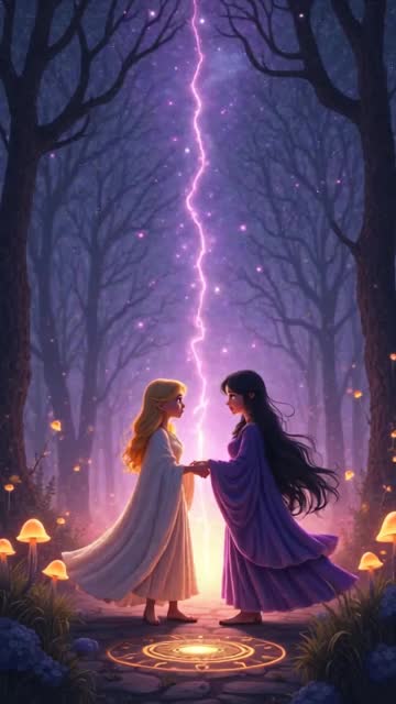 Emotional Disney-style musical duet between a brave princess (Elira) and a misunderstood forest witch (Mavra), Expressive female vocals in harmony and solo, dramatic orchestration with swelling strings, piano, celesta, choir, and magical effects (glittering chimes, soft wind), The mood is emotional, mystical, and cinematic – like “Frozen 2” meets “Wicked, ” The song builds from gentle intimacy to a powerful, heroic climax celebrating unbreakable friendship