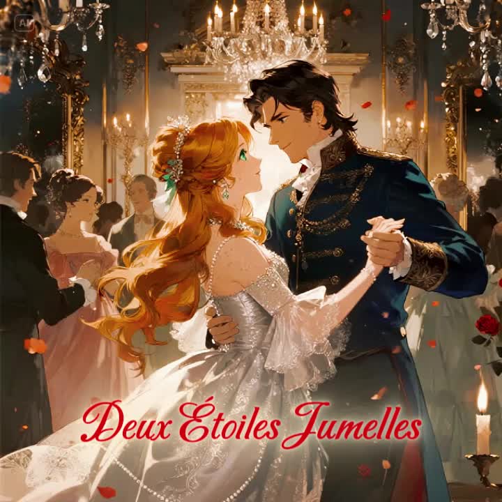 Create a heartfelt French Disney-style Romantic Ballad, The song should sound like the emotional finale of a fairy tale musical, with rich orchestration — sweeping strings, harp glissandos, soft woodwinds and harpsichord for an 18th-century feel with grand orchestral swells, The vocals should alternate between a male tenor (Émeric) and a female soprano singer (Émeraude), who reunite at a royal ball after being kept apart by duty and deception, Their voices are filled with awe, longing, and joy as they recognize one another, In the choruses, they should sing together in tight, expressive harmony to create a magical, soaring feeling, Think of the romantic emotion in animated fairy tales movies, The mood is tender, magical, and triumphant — a perfect “happily ever after, ” The lyrics should be in French, poetic, and full of feeling, Tempo: Moderato, waltz-like 3/4 time for verses, soaring 4/4 for chorus, Key Change: Shift to a higher key for the final chorus