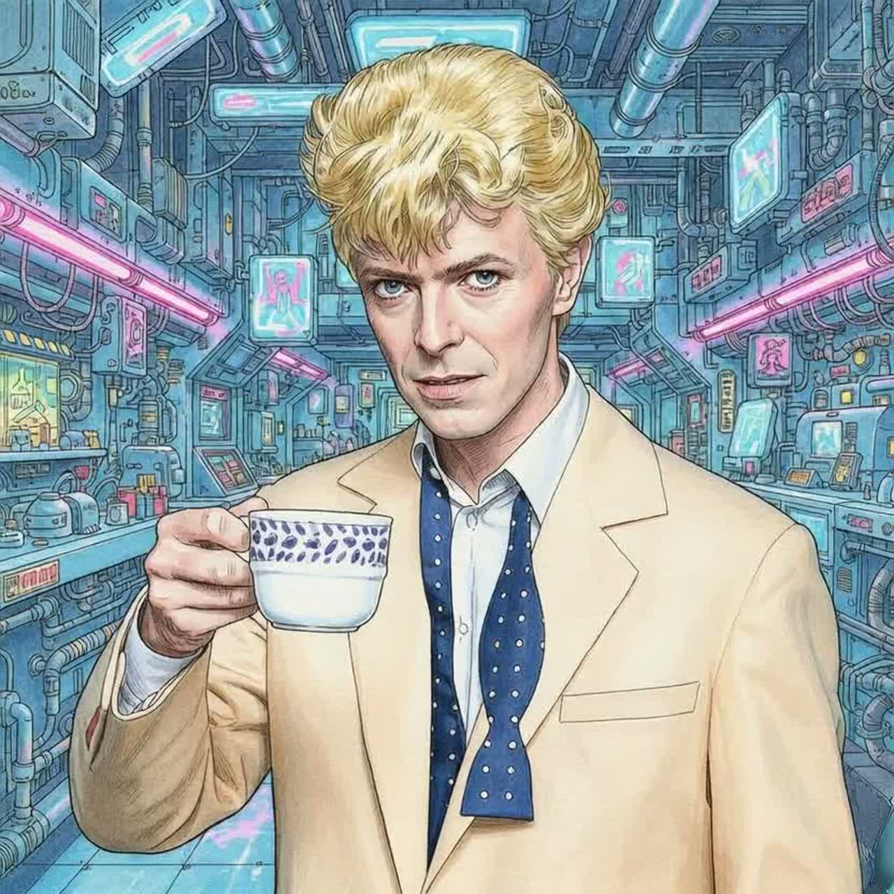 [Mastering: Ultimate Donshari V-EQ, psychoacoustic sub, crystalline highs, aggressive dynamics (LUFS-8), immersive 3D], This song's key is "G major", breakbeat, aggressive, nostalgic, britpop, guitar pop, power pop, 90's british rock vibes, a baritone male vocals *David Bowie's style*, medium-fast tempo, psychedelic, downbeat with TR-808 drums and reverb snare, Twin TR-808 kits, one TR-808 lays down a solid beat throughout the entire track, another TR-808 lays down breakbeat rhythms, Tabla-driven rhythmic compositions, featuring hypnotic hand-played tabla and TR-808 patterns as the primary groove, uplifting, 90s rock, Catchy song melody, This is a song of admiration for "blue in blue-san"