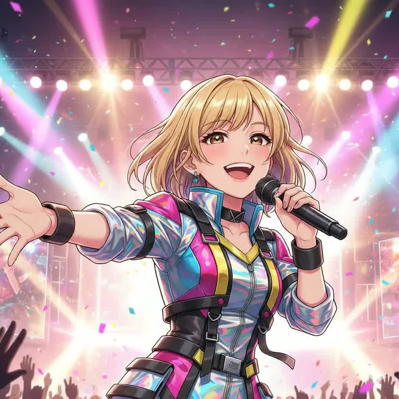 breakbeat, A high-energy, upbeat idol pop song with a bright and lively feel, The music features a driving drum beat with a pop-punk tempo and a powerful, energetic bassline reminiscent of a Rickenbacker, The lead instrument is a clean electric guitar playing catchy, melodic riffs and upbeat power chords, enhancing the cheerful mood, The vocals are performed by a group of five female singers, with a cheerful, energetic