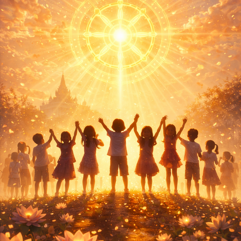 Female lead vocal with a gentle, slightly childlike tone, blended into a mixed youth choir (boys and girls), Group vocals are central, with unison singing, simple harmonies, and light call-and-response, Boy and girl vocals are balanced, creating a warm choir feel rather than a solo-focused song, Occasional brief solo lines return quickly to full ensemble singing, Instrumentation: Euphonium, Harpsichord, Double Bass, Harp, Orchestra, Ethereal, gospel-inspired pop with a bright, uplifting, clapping-friendly groove, Theme: light as awareness and presence, Positive, modern Buddhist vibe (Buddha as a guide, not a god), English lyrics, clear blended vocals, energetic yet gentle and hopeful
