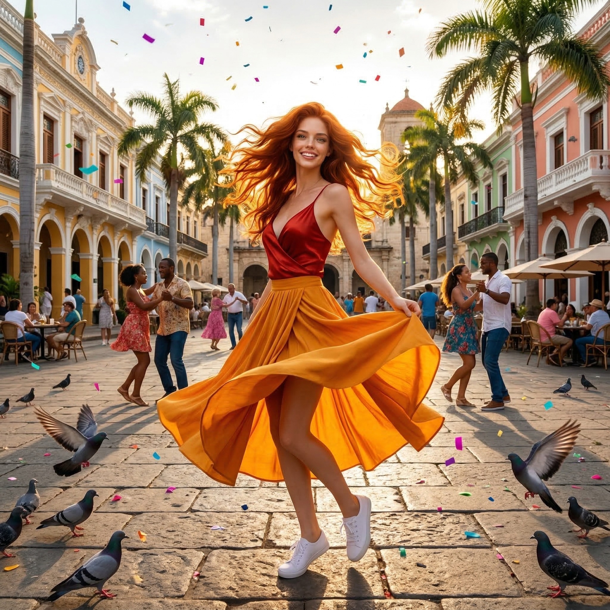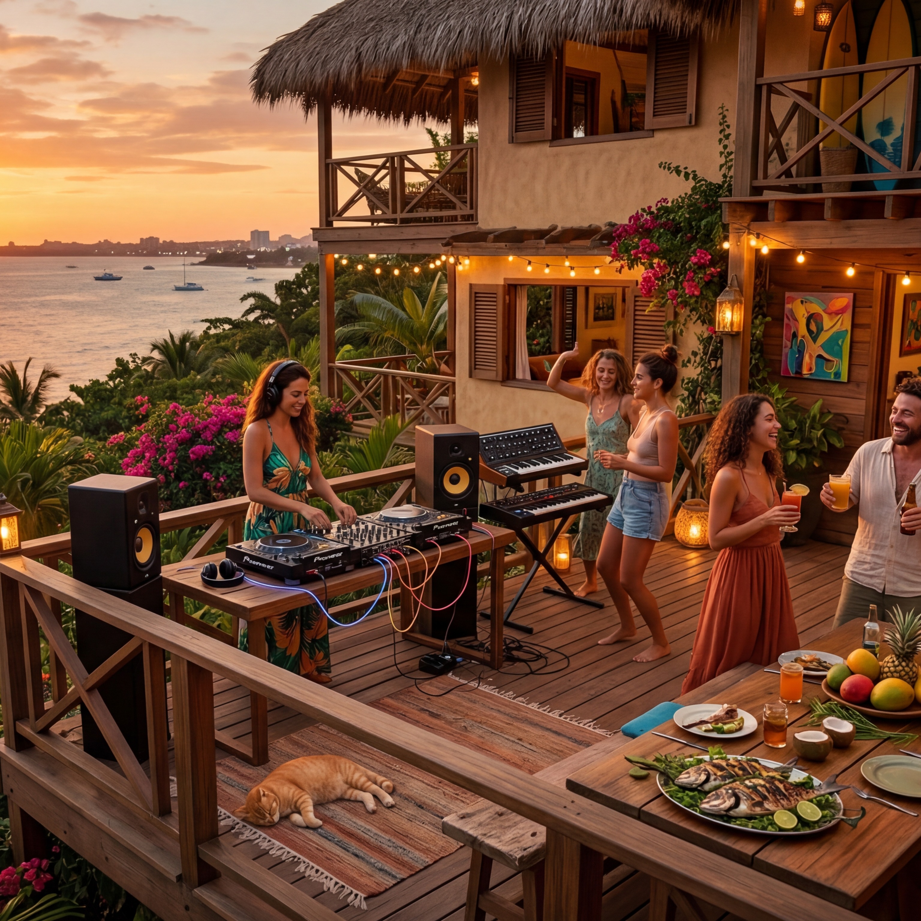 merengue, bachata, tropical house, reggae, reggaeton, energetic rhythms, joy of discovering, happy, positive, groovy bass, piano, acoustic guitar, trumpets, bright synths