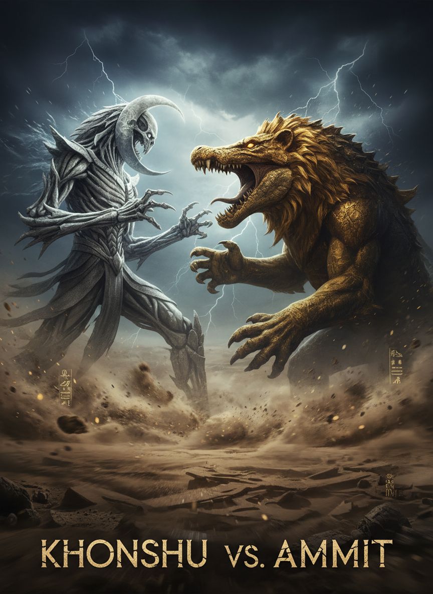 FERAL EGYPTIAN INDUSTRIAL, Ancient ritual combat atmosphere, Mid-tempo stalk (95–105 BPM), Heavy frame drums and taiko-style hits, Metallic rattles and sistrum textures, Low desert wind and sand movement, Industrial elements are controlled and weighted, not harsh, No piercing highs, No chaotic distortion, Pressure over noise, Sparse melody, ominous and minimal, Space between hits to build threat, Male vocal only, Low register for judgment and menace, Higher sung lines for cold authority, No rap, No choir, No club energy, No cinematic trailer sounds, Overall tone: predatory, ancient, inevitable, Judgment unfolding in the dark