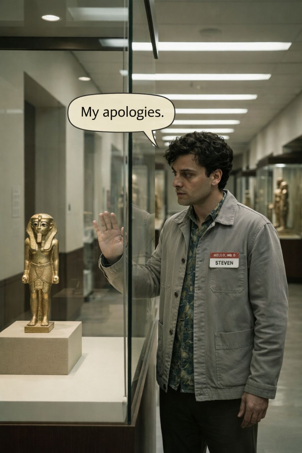 Mid-tempo restrained electronic with quiet psychological tension, Minimal percussion with a steady, deliberate pulse, Calm, conversational atmosphere that feels observant and uneasy, No big build, no drop, no cinematic swell, Modern and grounded, not emotional or dramatic, Mood is alert and attentive, not sad, hopeless, or lethargic, No Egyptian instrumentation, no chanting, no mythic tone, Male vocal, polite British accent, Clean, dry vocal delivery with no intimate mouth sounds or ASMR, Calm and conversational, but mentally alert and observant, Emotionally contained, not depressed or mournful, No whispering, no belting, no vibrato, no harmonies, Voice sounds like someone staying composed while realizing something important
