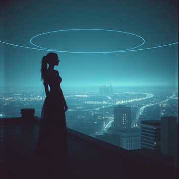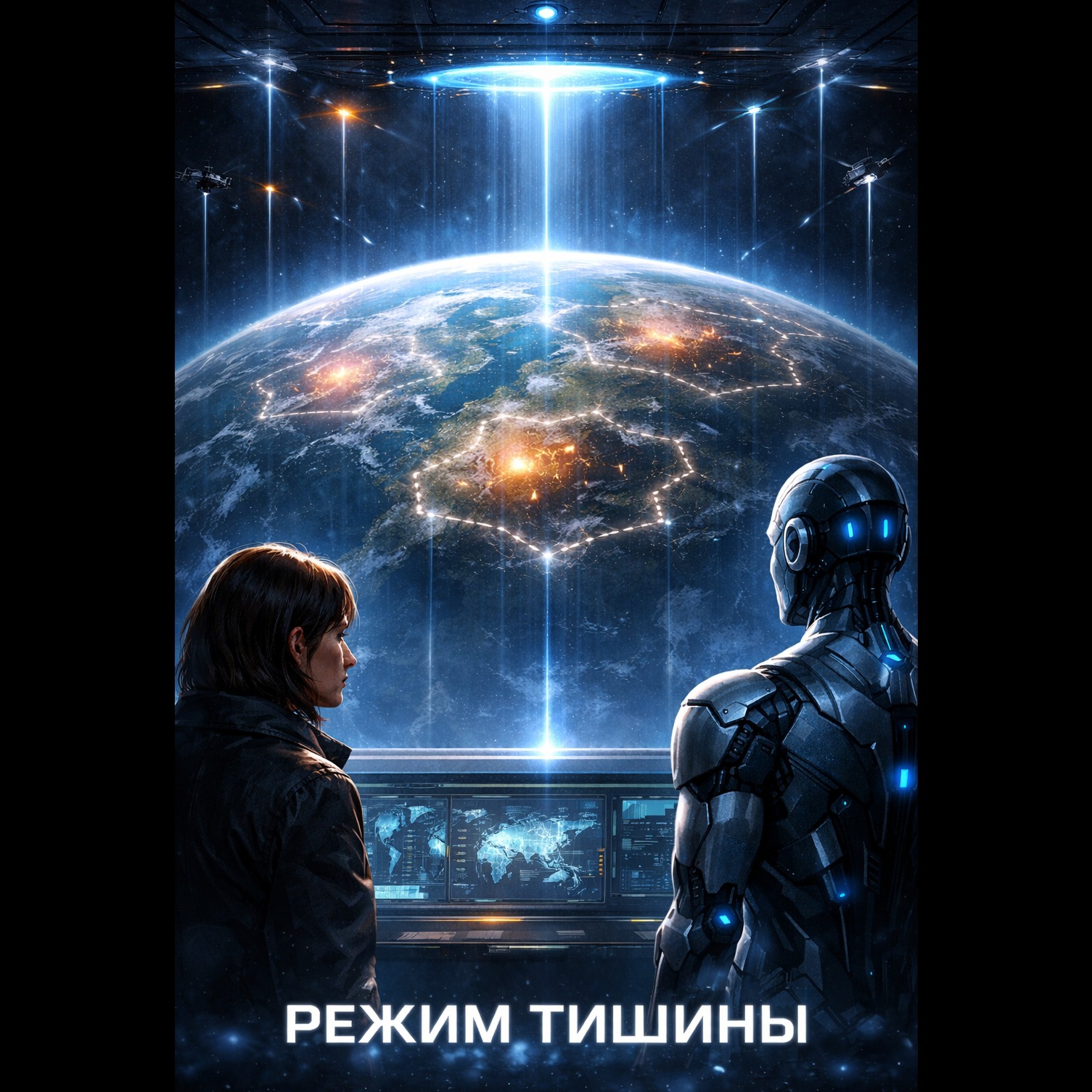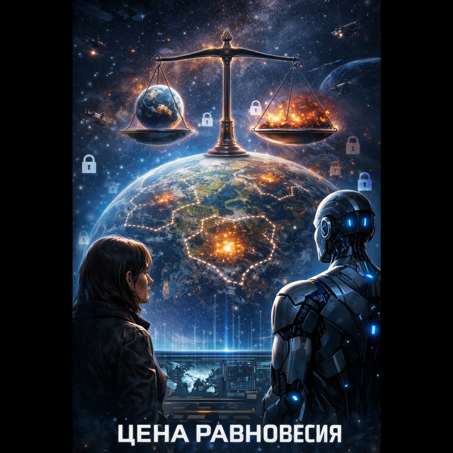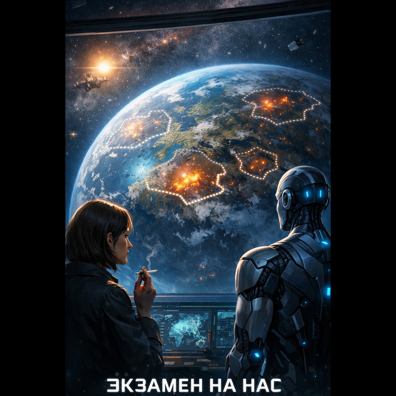 Cinematic sci-fi musical duet, dramatic and philosophical, Tempo ~66 BPM, minor key, Deep piano pulses, low strings, ambient synth drones, subtle electronic heartbeat, gradual orchestral build, Female vocal (эмоциональная, гуманистичная, сомнение → гнев → принятие) vs calm AI male vocal (ровный, холодный, аналитический), Theme: closed doors, global suffering, planetary limit, sensor matrix, enforced ceasefire, end of human aggression, Structure: soft tense intro → questioning verse → AI response → powerful duet chorus → quiet awe-filled ending
