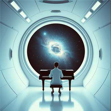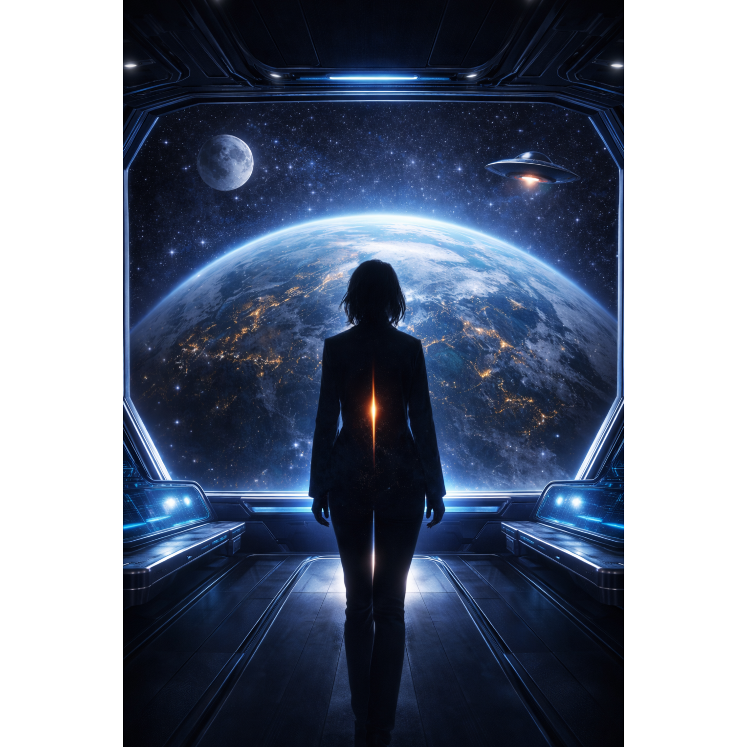 Cinematic philosophical sci-fi musical ballad, female lead vocal, 72 BPM, key F minor, duration about 3:00, Slow atmospheric intro with soft piano, airy pads, distant space ambience, Gradual orchestral build: warm strings, subtle synth bass, light percussion heartbeat, Mood: awe before Earth from orbit, fear turning into responsibility and destiny, Clear lyrical melody, theatrical phrasing, emotional but restrained, Chorus expands with full strings and soft choir, luminous yet tense, Bridge minimal and suspended, Final chorus powerful but unresolved, fading into cosmic silence