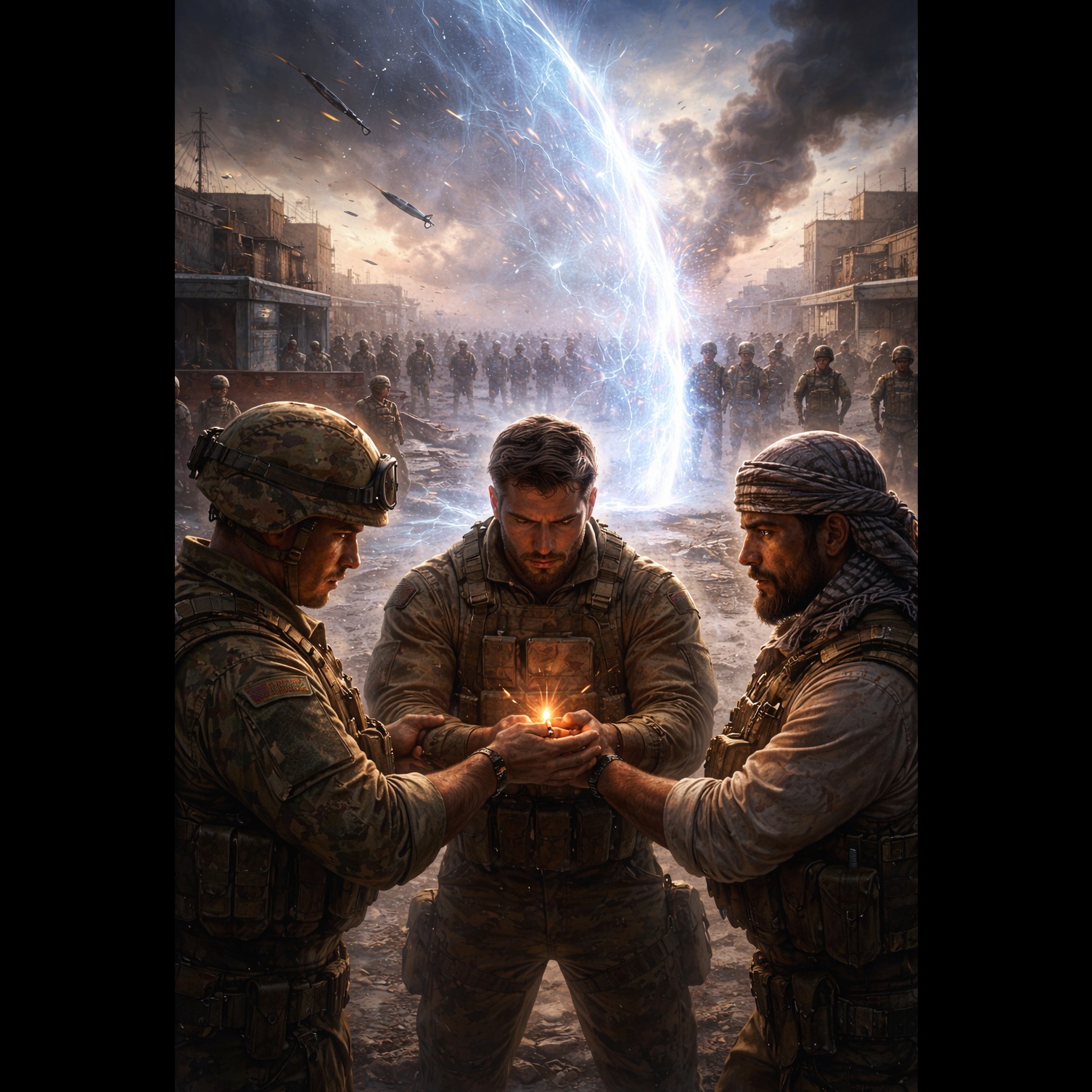 Cinematic Middle-Eastern dramatic musical theatre piece with restrained tension, Tempo ~70 BPM, minor key, Female vocal (calm, steady soldier tone) with male baritone and mixed choir, Sparse oud motif, low strings, distant frame drums, subtle military snare pulses, Rising orchestral swell in chorus with choir harmonies, Theme: ceasefire at checkpoint, bullets stopped mid-air, enemies facing each other in silence, fragile beginning of dialogue, Structure: tense verse → choral build → intimate trio chorus → quiet reflective outro fading into wind and distant drones