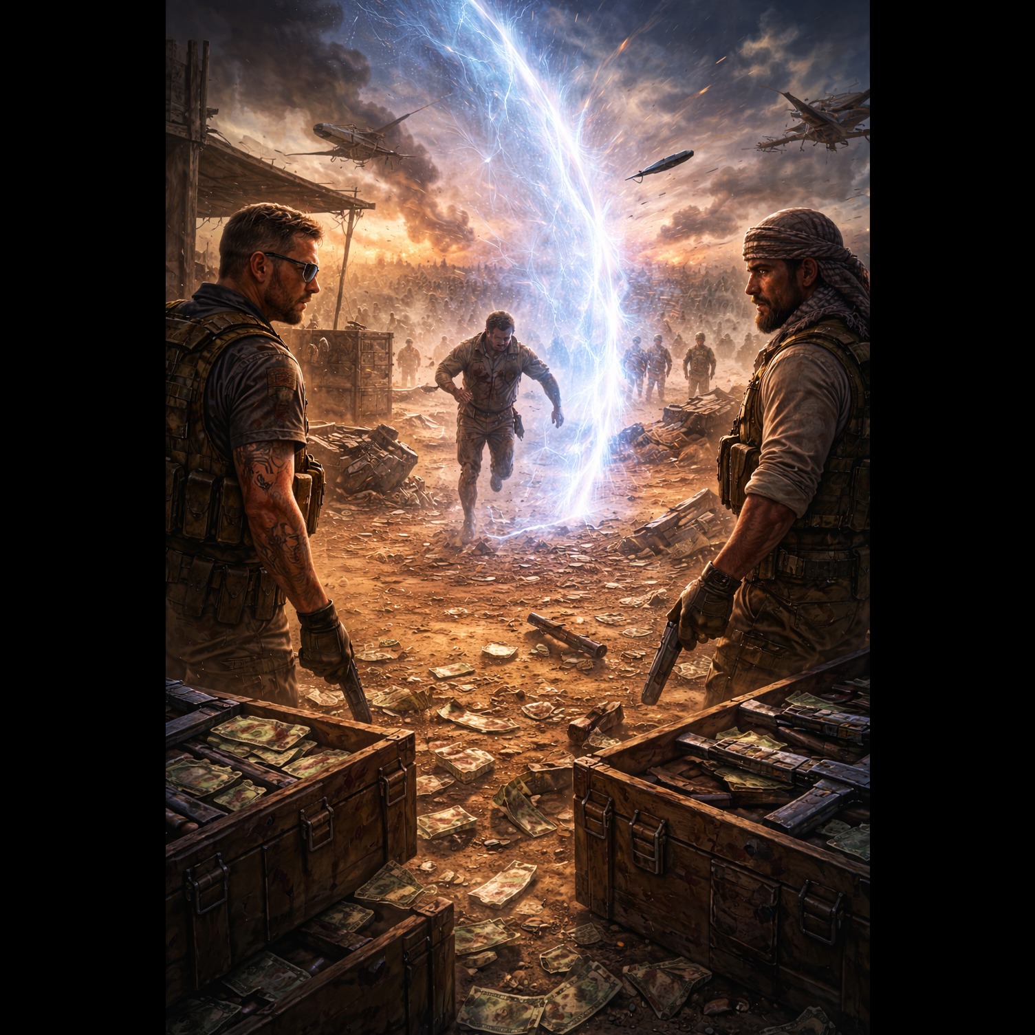Dark cinematic industrial musical theatre piece with African desert atmosphere, Tempo ~76 BPM, minor key, Male lead vocal (cold, cynical → shaken → tense), secondary male voice for confrontational lines, Deep taiko-style drums, low strings, distorted bass pulse, metallic percussion, subtle desert wind ambience, Chorus with powerful mixed choir and heavy orchestral hits, Theme: arms dealer, war as business, bullets stopped mid-air, market collapse, “eye in the sky, ” Structure: gritty verse → rising tension → explosive chorus → sharp duet bridge → dark fading outro with wind and distant drones