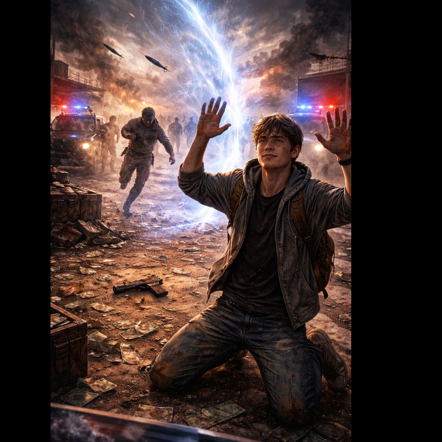 Gritty urban cinematic musical with hip-hop influence, Tempo ~92 BPM, minor key, Male lead vocal (angry, raw, street tone → breaking → ironic laugh), Punchy electronic beat, deep 808 bass, distorted synth stabs, sparse piano in verses, Siren FX, glass shatter hits, heavy percussion build in chorus with layered male choir, Theme: broken home, failed robbery, bullets missing, chaos frozen, sudden inner release, Structure: tense rap-like verse → explosive hook → chaotic bridge → stripped emotional outro ending with dry laugh